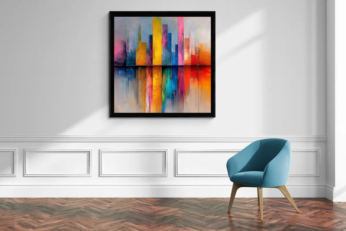 „Farbsilhouette“ ist ein faszinierendes Spiel von Licht und Farbe, das eine Skyline in ihrer abstraktesten Form darstellt. Die leuchtenden Farben und klaren Linien der Gebäude spiegeln sich harmonisch im Wasser wider und schaffen eine einzigartige Balance zwischen Struktur und Freiheit. Diese Komposition verleiht jedem Raum eine dynamische Ausstrahlung und zieht die Blicke magisch an.