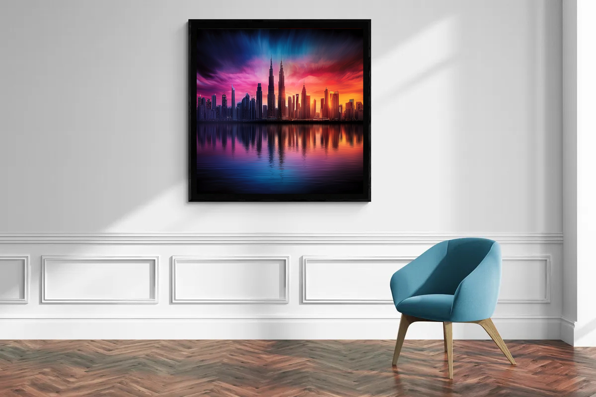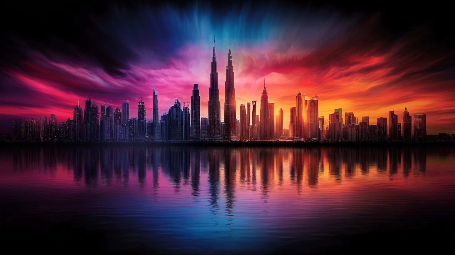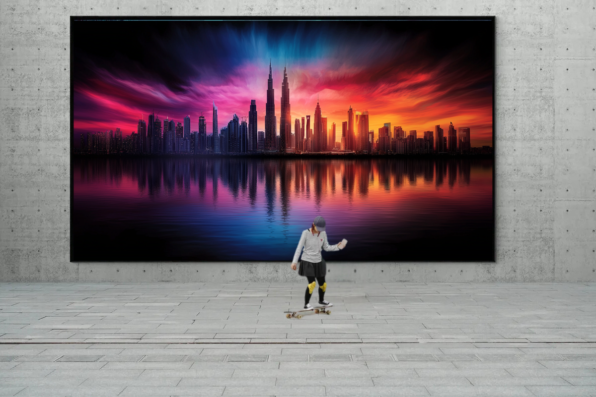 „Feuerhimmel über der Skyline“ präsentiert eine moderne Metropole, die unter einem atemberaubenden Himmel in glühenden Rot-, Violett- und Blautönen leuchtet. Die hohen Gebäude spiegeln sich sanft im ruhigen Wasser und schaffen ein Bild von seltener Harmonie und Kraft. Der dramatische Farbverlauf des Himmels zieht den Betrachter sofort in seinen Bann und vermittelt eine beeindruckende Atmosphäre zwischen Tag und Nacht.