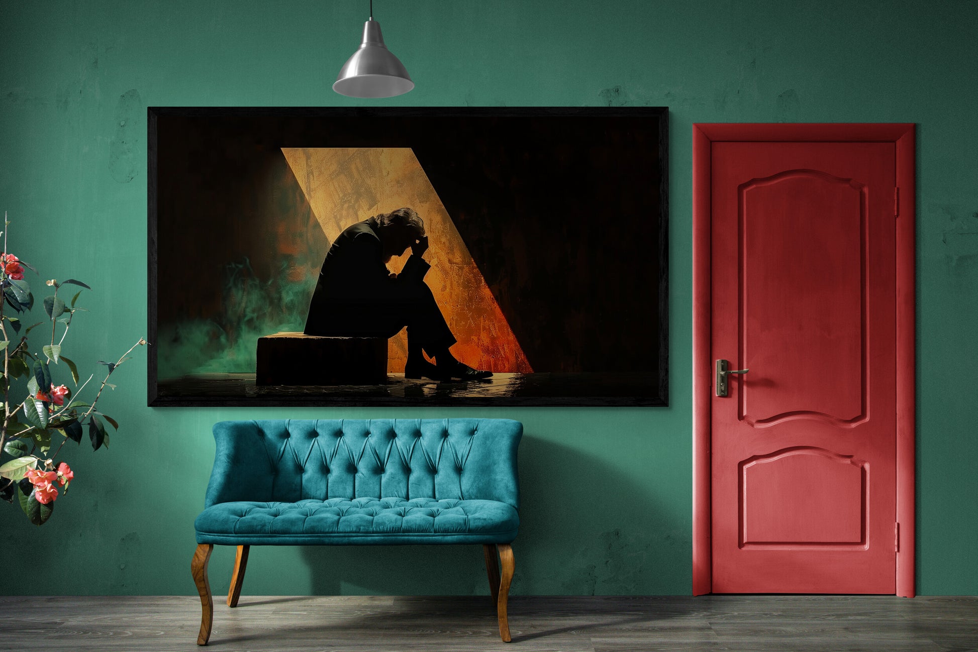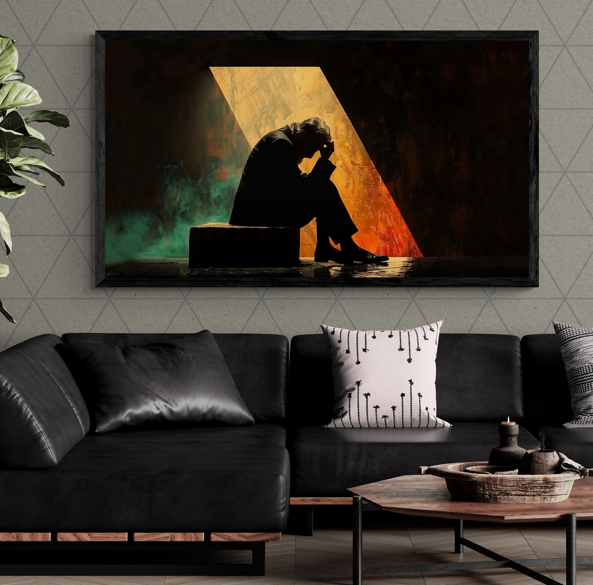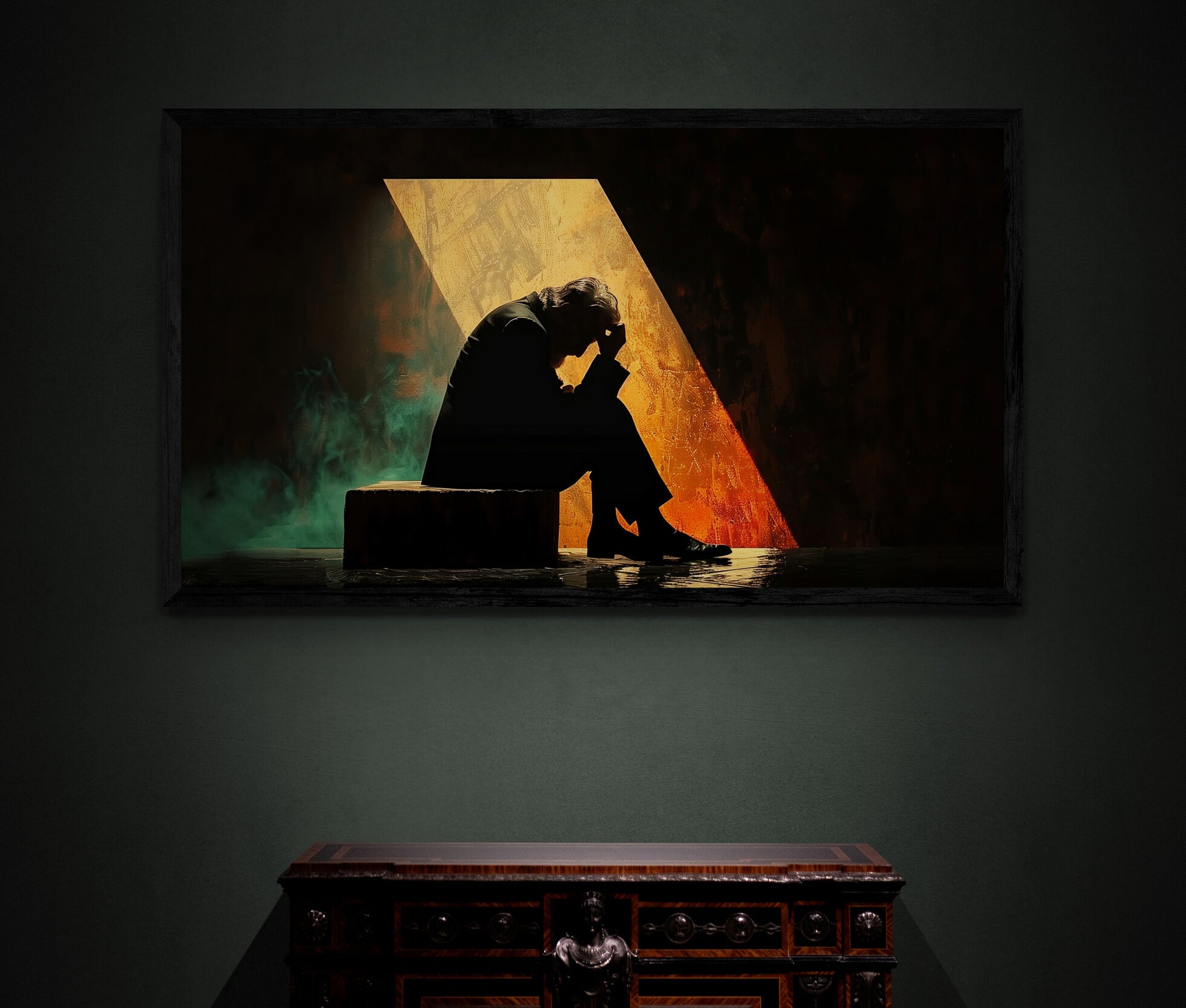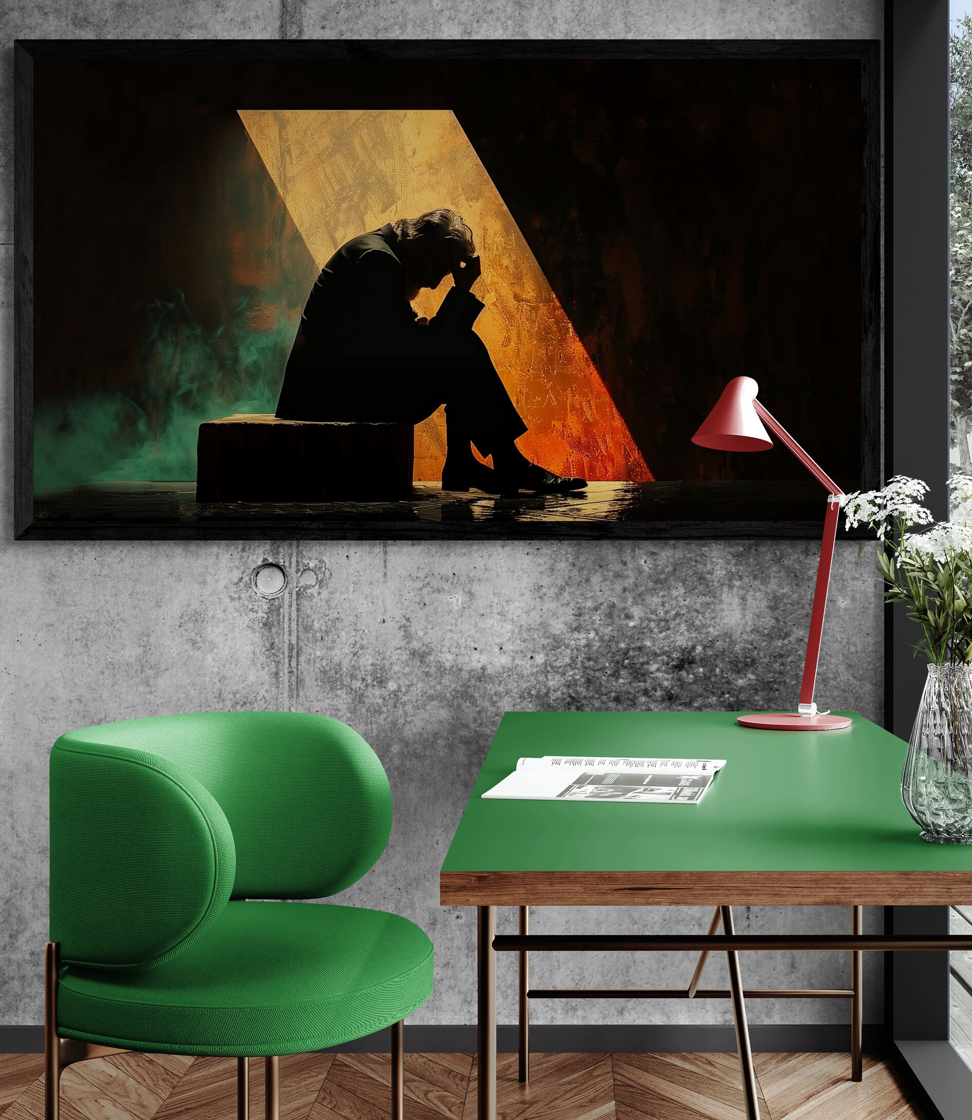 „Flächen der Last“ ist ein ausdrucksstarkes Kunstdruck-Motiv, das einen Mann in einem Moment tiefer Versunkenheit zeigt. Das strahlende Orange im Hintergrund kontrastiert eindrucksvoll mit dem dunklen Vordergrund und deutet auf den Konflikt zwischen innerer Schwere und der Möglichkeit einer klaren Perspektive hin. Eine geheimnisvolle Nebelschicht in Grün-Blau-Nuancen verleiht dem gesamten Werk eine beinahe dramatische Intensität und macht es zu einem atmosphärischen Blickfang.