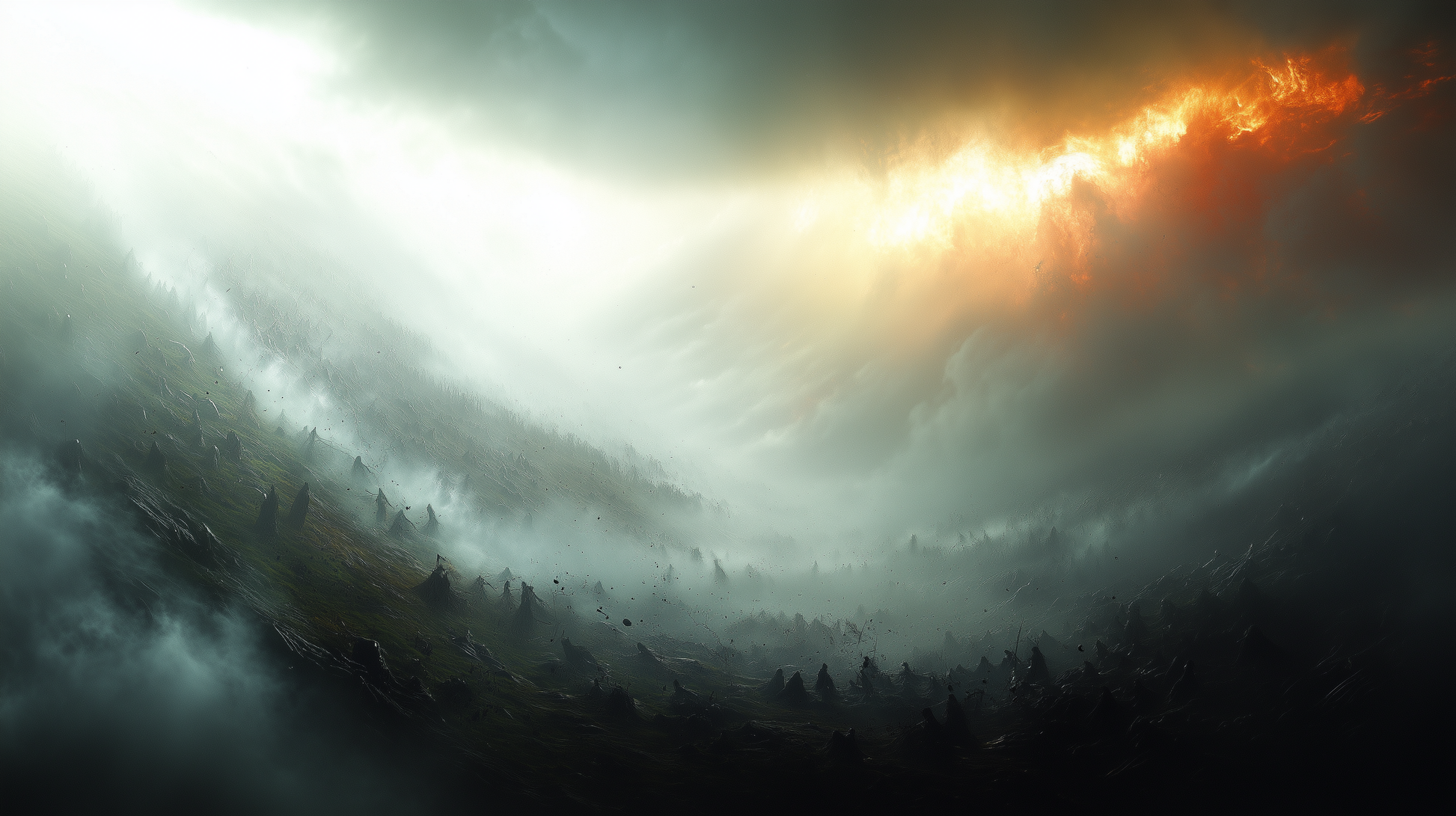 - Feuer und Licht im Himmel: Eine brennende Linie aus Glut, die wie ein Riss in der Realität die Hoffnung und den Wandel symbolisiert.