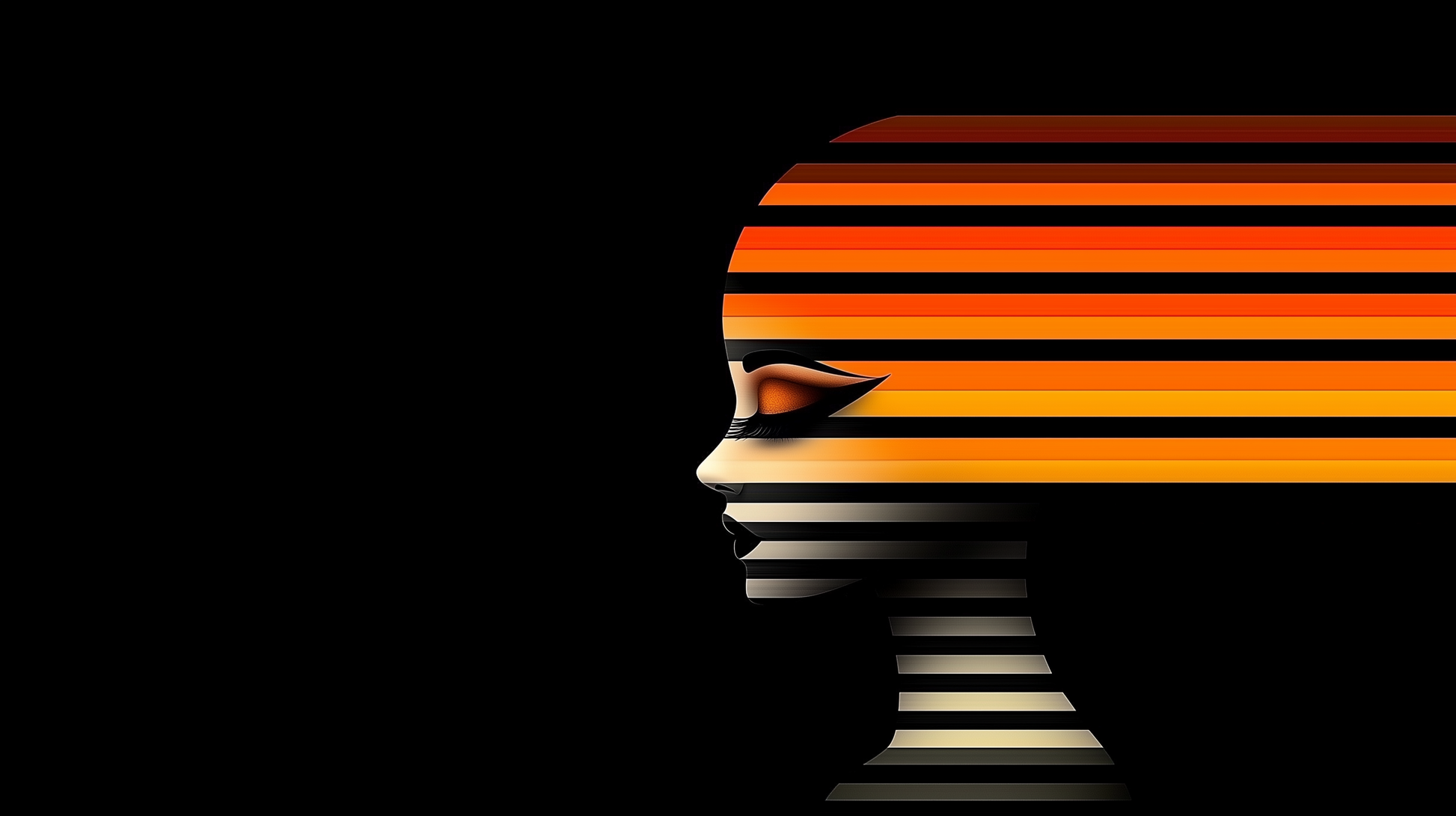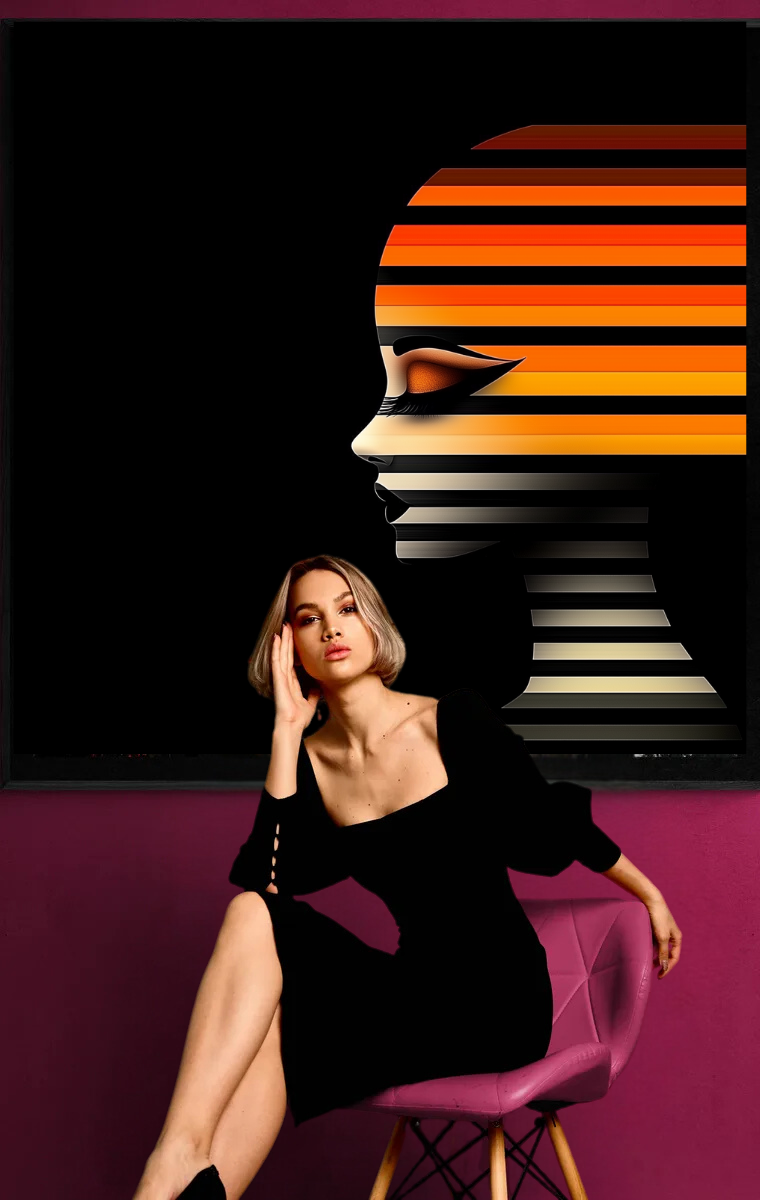 Das Werk „Flammen des Geistes“ vereint Minimalismus und Eleganz in einer Symbiose aus Linien, Formen und Farben. Die horizontale Streifengestaltung, die subtil über das Gesicht einer Frau verläuft, symbolisiert die Dualität zwischen Stille und Dynamik. Die dominierenden Schwarz- und Orangetöne wecken Assoziationen von Feuer, Leidenschaft und innerer Stärke.