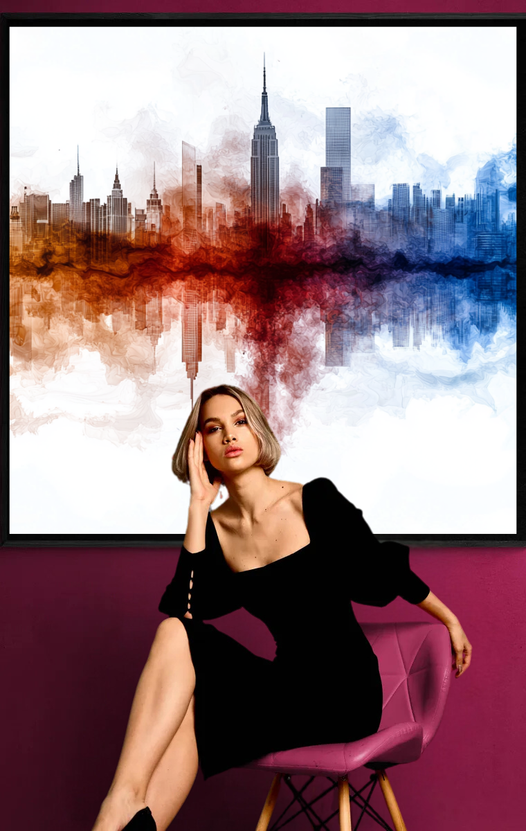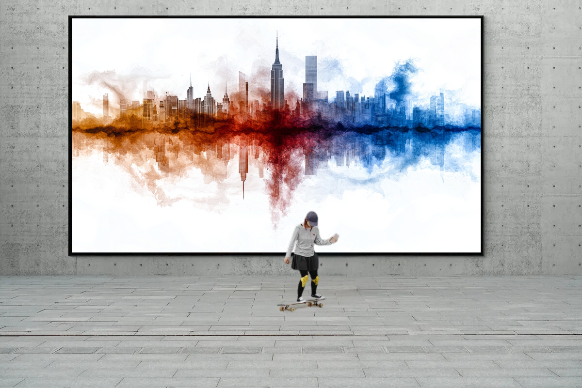 In diesem eindrucksvollen Kunstwerk erhebt sich die Silhouette einer modernen Skyline, die durch eine symmetrische Spiegelung in kontrastierenden Flammen- und Blautönen dargestellt wird. Der fließende Übergang von warmen Braun- und Rottönen zu kühlen Blautönen symbolisiert eine Harmonie zwischen Feuer und Wasser, zwischen städtischer Energie und Ruhe. Die weiche, wolkenartige Textur verleiht der Szenerie eine lebendige und dennoch verträumte Atmosphäre.