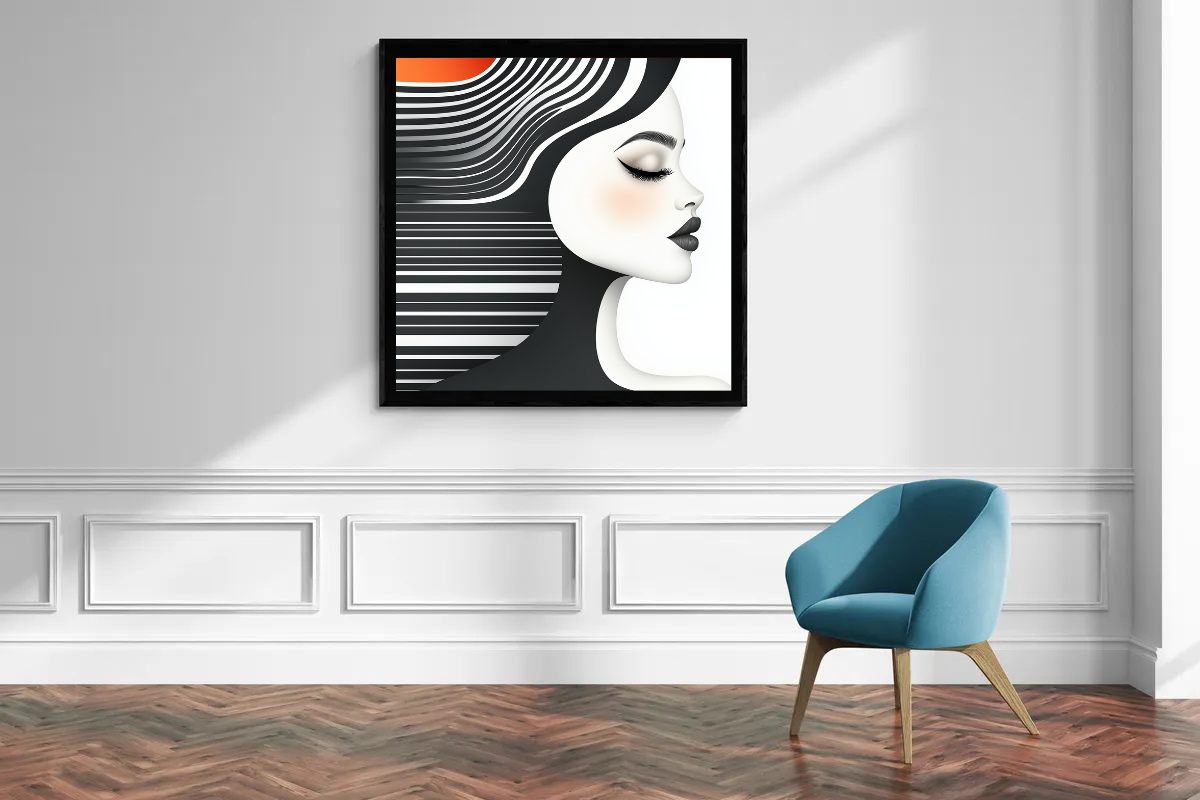 „Fließende Gedanken“ zeigt ein weibliches Profil in einem stilisierten, modernen Design, das eine elegante Mischung aus Schwarz, Weiß und sanften Schattierungen darstellt. Fließende Linien umrahmen die Silhouette und symbolisieren den Gedankenfluss und die Harmonie des Inneren. Das Zusammenspiel von schlichten Farben und geschwungenen Formen verleiht diesem Kunstwerk sowohl eine zeitlose Schönheit, die stilvoll als auch inspirierend wirkt.