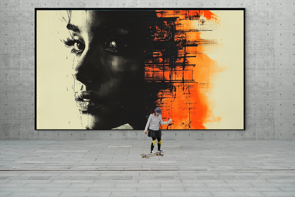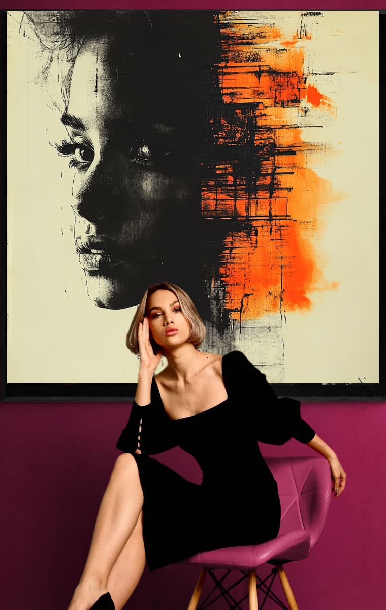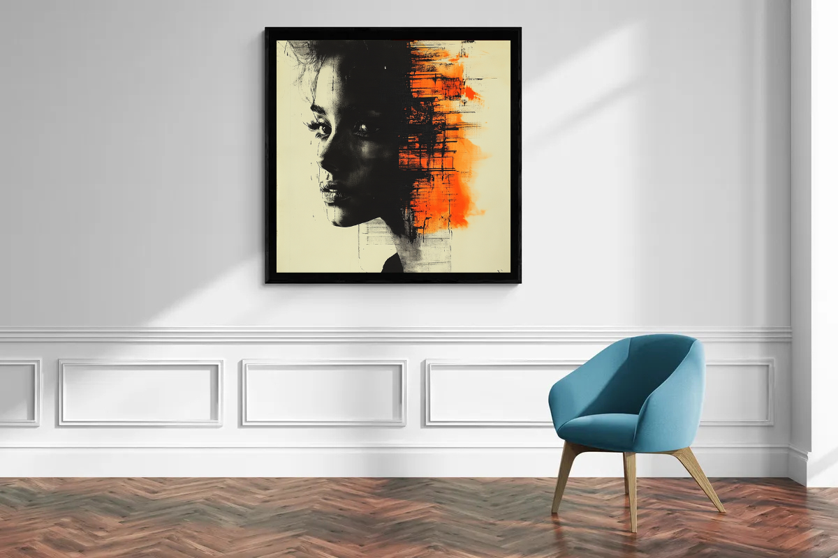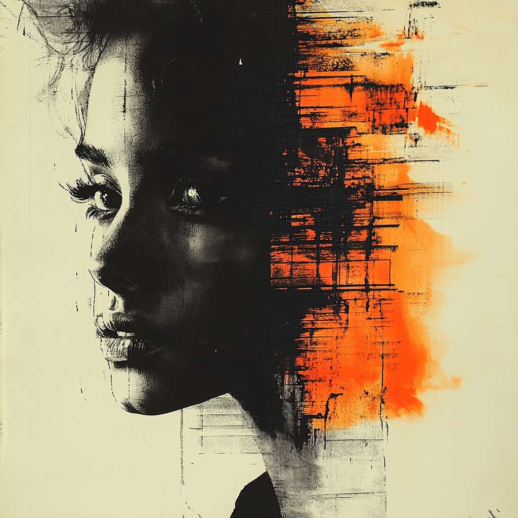 „Fragmente der Seele“ ist ein faszinierendes Kunstwerk, das die emotionale Tiefe und die Zerbrechlichkeit des menschlichen Geistes einfängt. Die Schwarz-Weiß-Silhouette eines Frauenporträts verschmilzt mit abstrakten, orangenen Farbstrukturen, die wie flüchtige Gedanken oder Erinnerungen wirken. Der Stil erinnert an Asemic Writing und verleiht dem Bild eine geheimnisvolle und doch intime Atmosphäre, die den Betrachter in ihren Bann zieht.