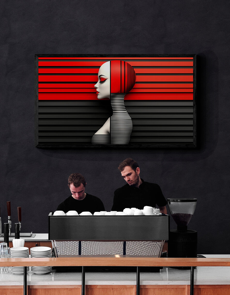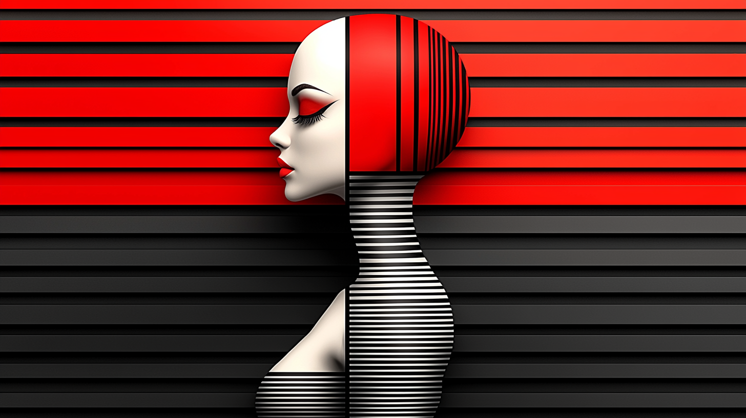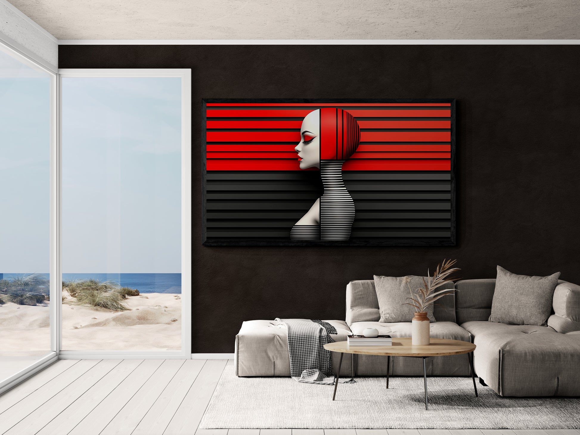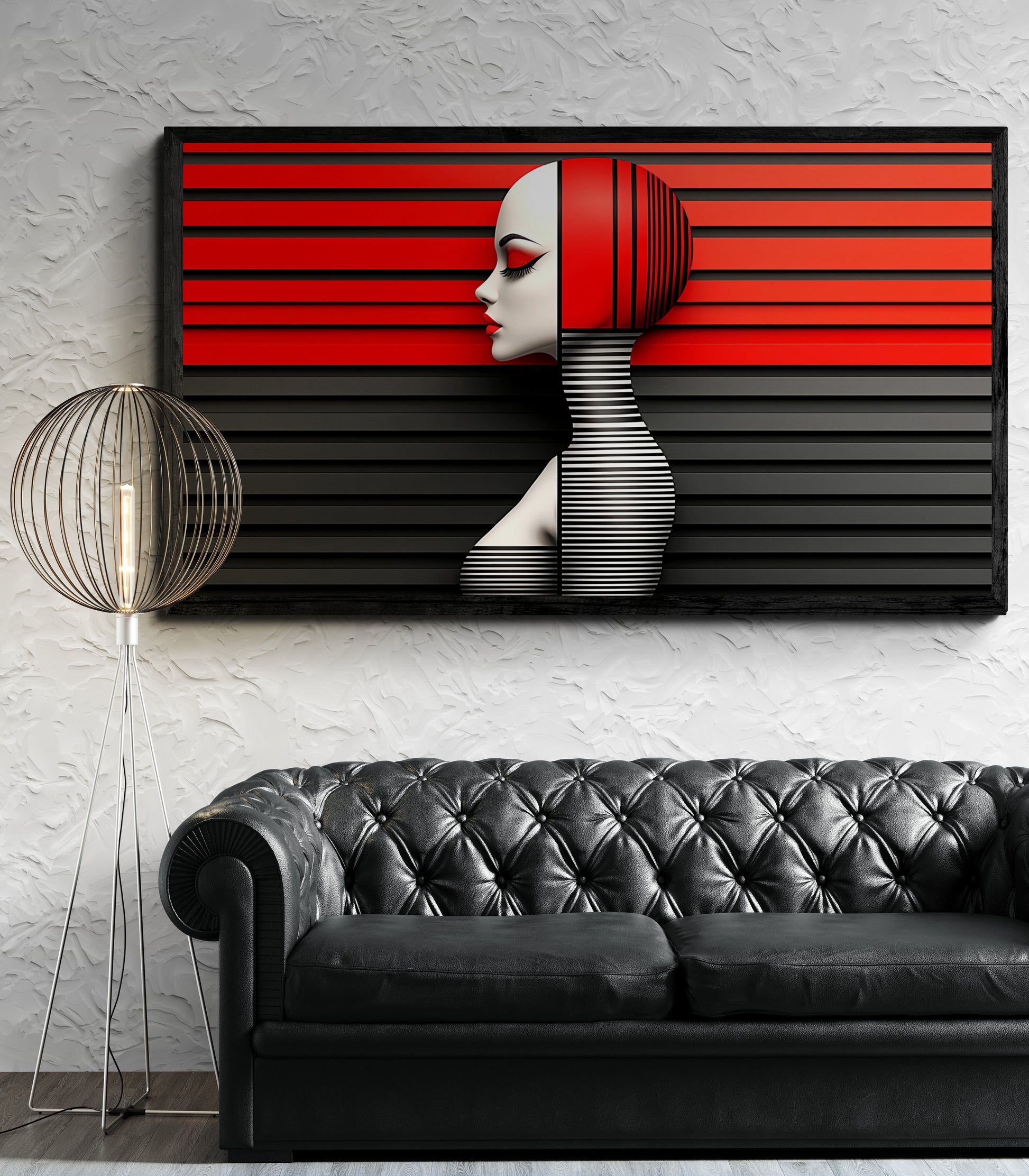 - Das Profil der Frau: Die Figur wird in einem minimalistischen, seitlichen Profil gezeigt, das elegant und klar dargestellt wird. Der Kopf der Frau ist in kräftige, horizontale rote und schwarze Streifen unterteilt, was dem Bild eine starke visuelle Struktur verleiht.