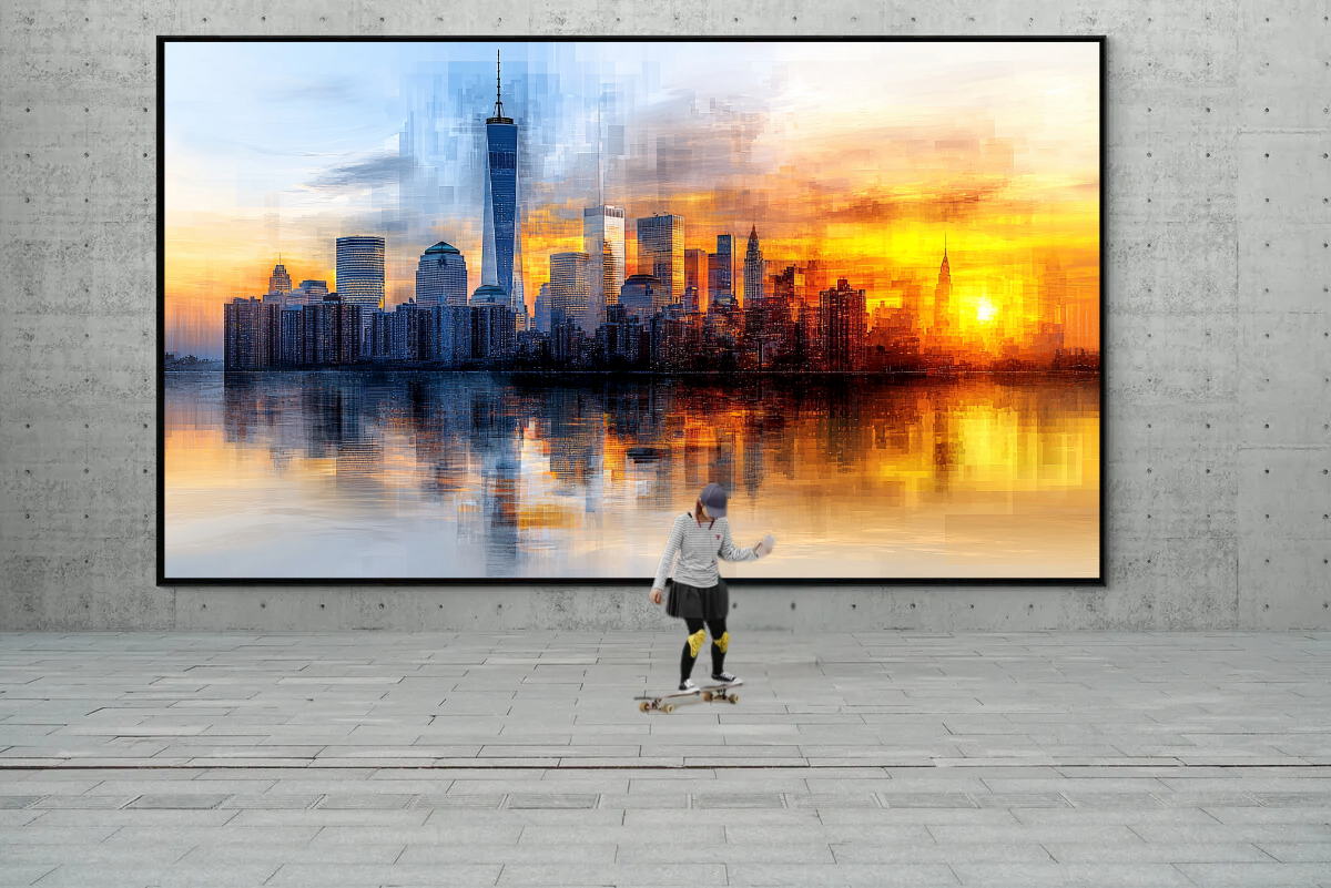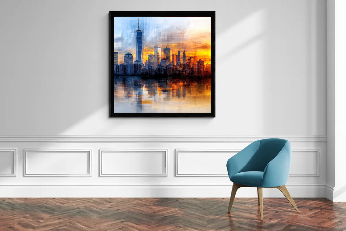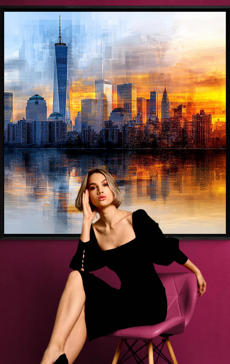 Dieses beeindruckende Bild zeigt eine moderne Skyline in einem geometrischen, pixelartigen Stil, der die Gebäude in rechteckigen Fragmenten darstellt. Die Sonne erhebt sich in leuchtenden Gold- und Orangetönen am Horizont und lässt das Wasser und die Gebäude in warmem Licht erstrahlen. Der Himmel verläuft von sanftem Blau im linken Bereich bis hin zu intensiven Goldtönen im rechten Bereich, wodurch ein harmonisches Farbspiel entsteht.