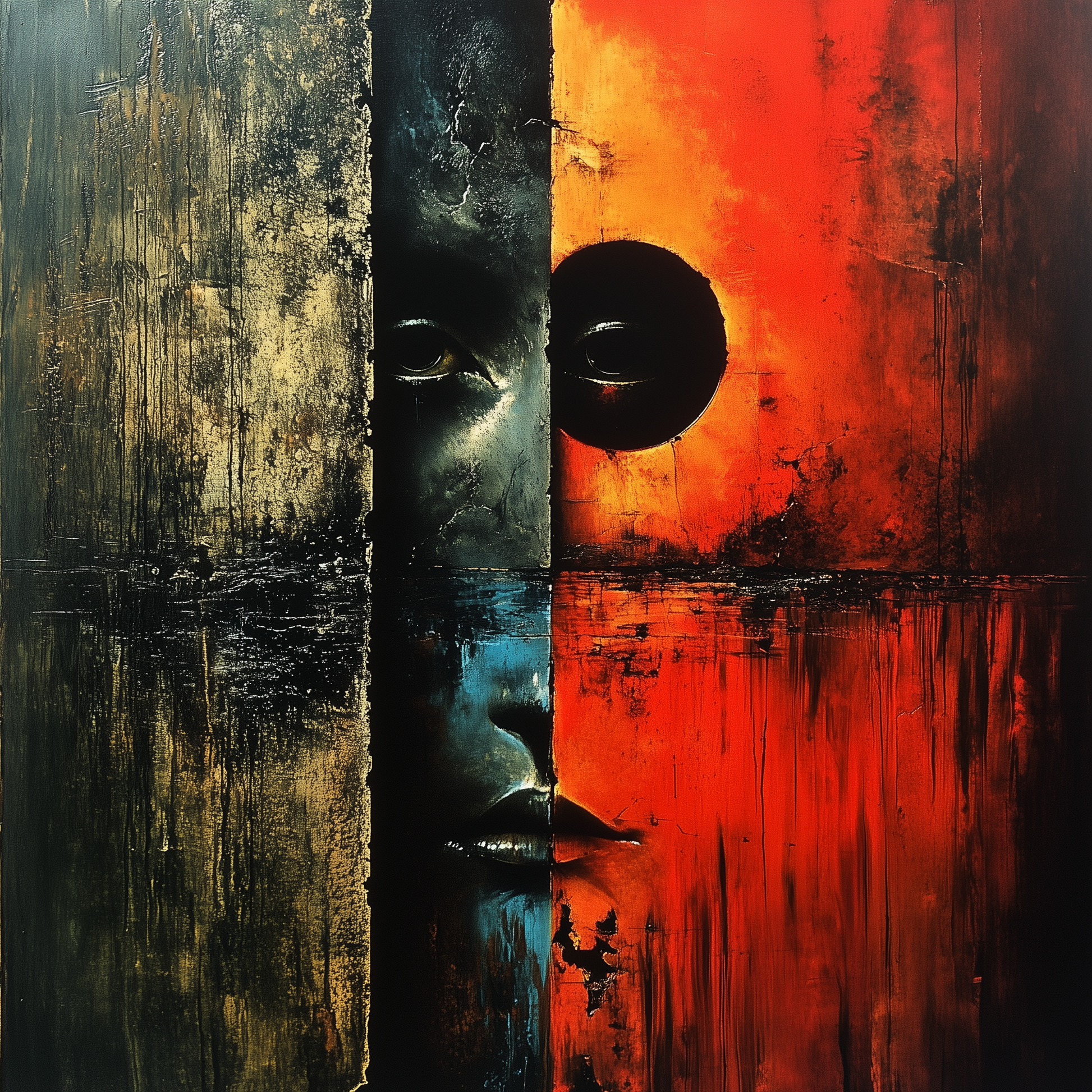 „Gesichter der Dualität“ ist ein packendes Kunstwerk, das die Kontraste zwischen Dunkelheit und Licht, Stille und Bewegung auf eindrucksvolle Weise darstellt. Mit einer geteilten Komposition und intensiven Farbverläufen erzählt das Werk eine Geschichte von inneren Konflikten und der Harmonie, die aus Gegensätzen entsteht.