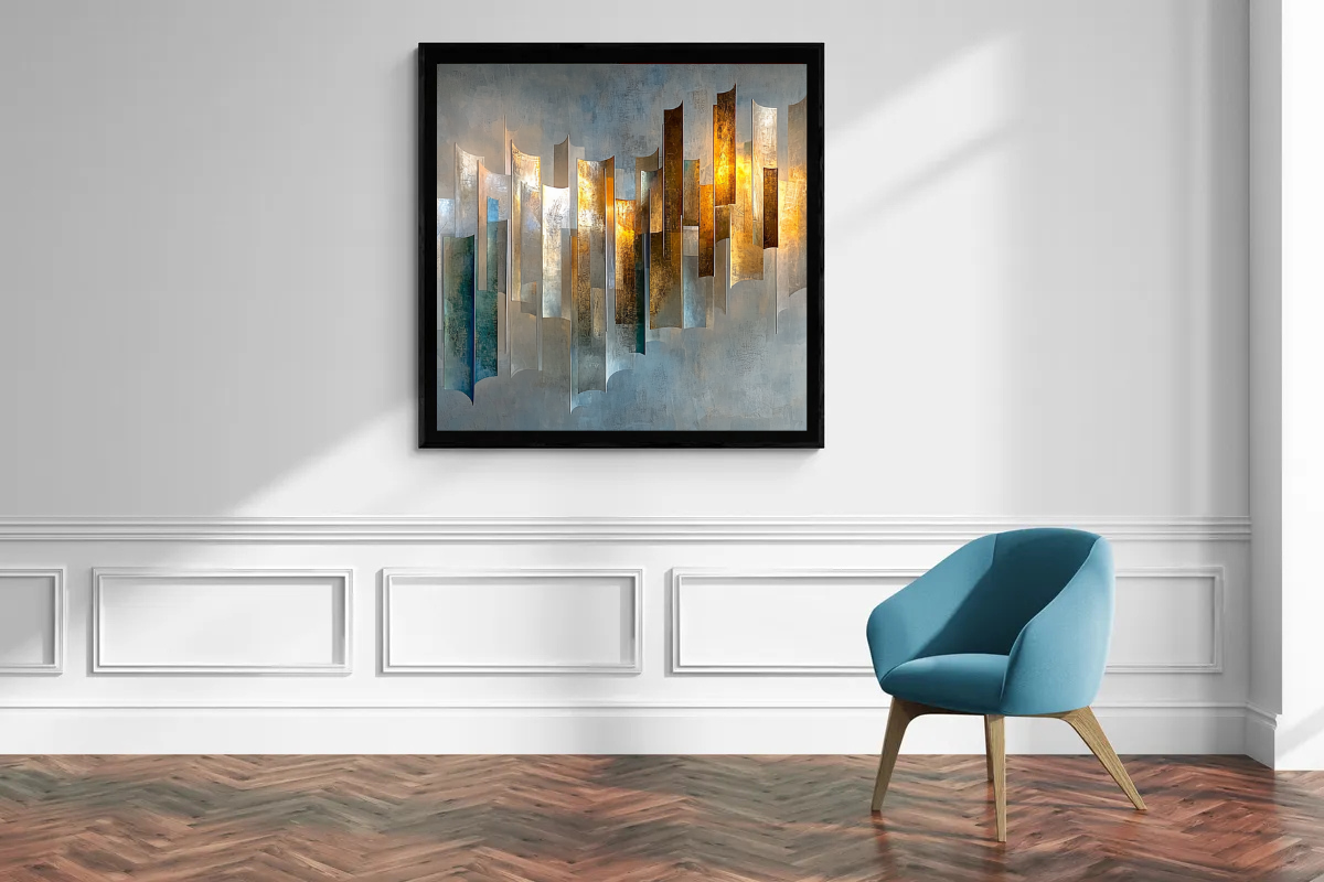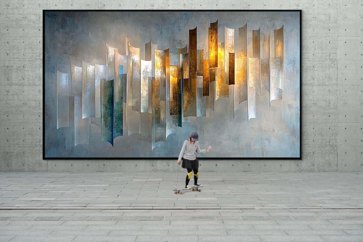 „Glanz der Stille“ fasziniert mit einer modernen Interpretation einer Skyline, die durch metallische Farben und subtile Texturen zum Leben erweckt wird. Das Werk kombiniert goldene, silberne und bronzene Nuancen und fängt so das sanfte Spiel von Licht und Schatten ein. Diese schimmernden Elemente verleihen dem Bild eine elegante und ruhige Ausstrahlung, die gleichzeitig kraftvoll und beruhigend wirkt.