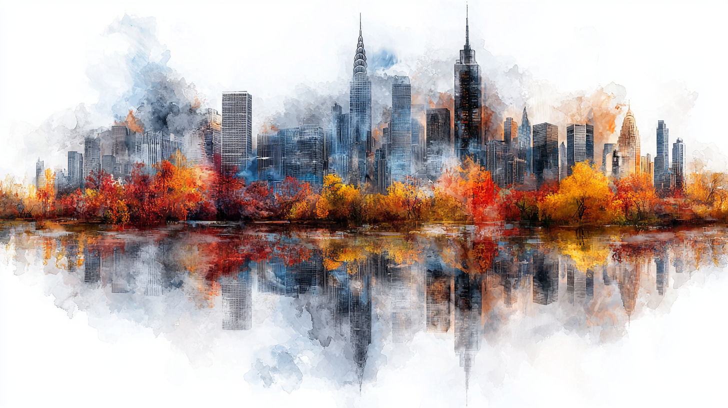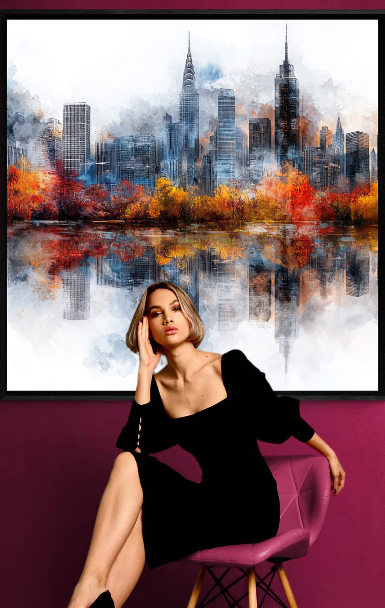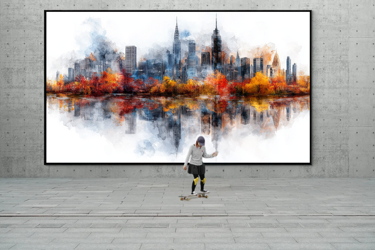 Dieses eindrucksvolle Kunstwerk zeigt eine moderne Skyline, umgeben von Bäumen in warmen Herbstfarben, die in leuchtenden Rot-, Gelb- und Orangetönen erstrahlen. Die Reflexion der Stadt und der Bäume im ruhigen Wasser darunter verstärkt die harmonische Farbpalette und verleiht dem Bild eine beruhigende Symmetrie. Die in kühlen Blau- und Grautönen dargestellten Gebäude bilden einen wunderschönen Kontrast zu den lebhaften, herbstlichen Farbtönen.