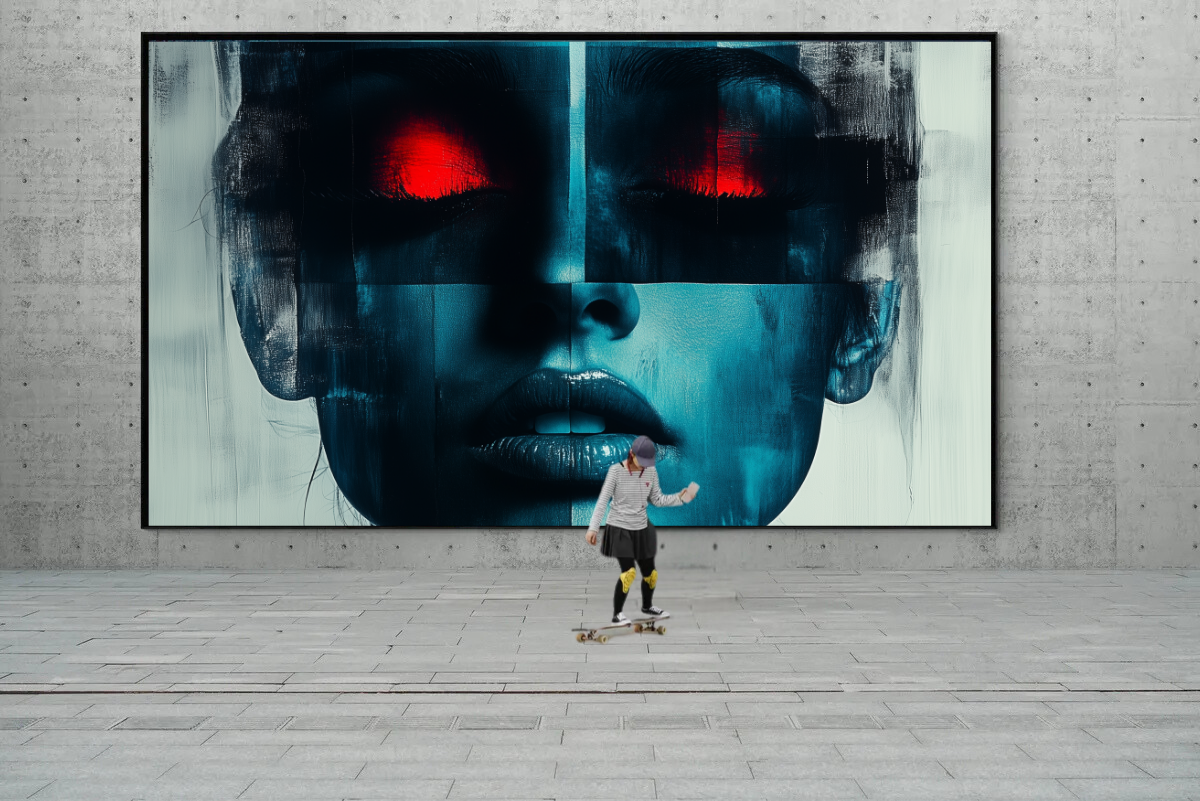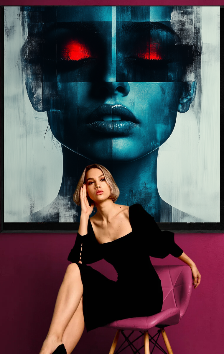 Die kühle Farbpalette in Kombination mit den glühend roten Akzenten zieht sofort alle Blicke auf sich und verleiht jeder Wand eine intensive, fast mystische Atmosphäre. Diese moderne Komposition, die wie ein digitaler Pinselstrich wirkt, verkörpert die perfekte Balance zwischen Chaos und Ruhe, was zum Nachdenken über die eigenen inneren Visionen anregt.