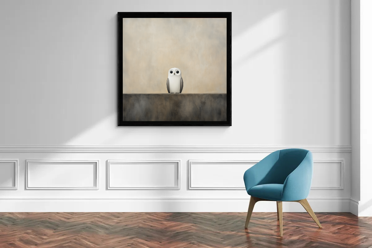 „Kleine Weisheit“ zeigt eine stilisierte Eule, die ruhig und gelassen auf einem dunklen Sockel sitzt. Das Kunstwerk ist in sanften Beige- und Grautönen gehalten, die eine beruhigende und schlichte Atmosphäre schaffen. Die Eule mit ihren großen, ausdrucksstarken Augen strahlt Ruhe, Weisheit und eine freundliche Neugier aus. Dieses Werk erinnert uns daran, die kleinen, stillen Momente zu schätzen und die Weisheit in den einfachen Dingen des Lebens zu erkennen.