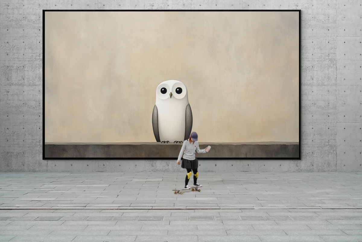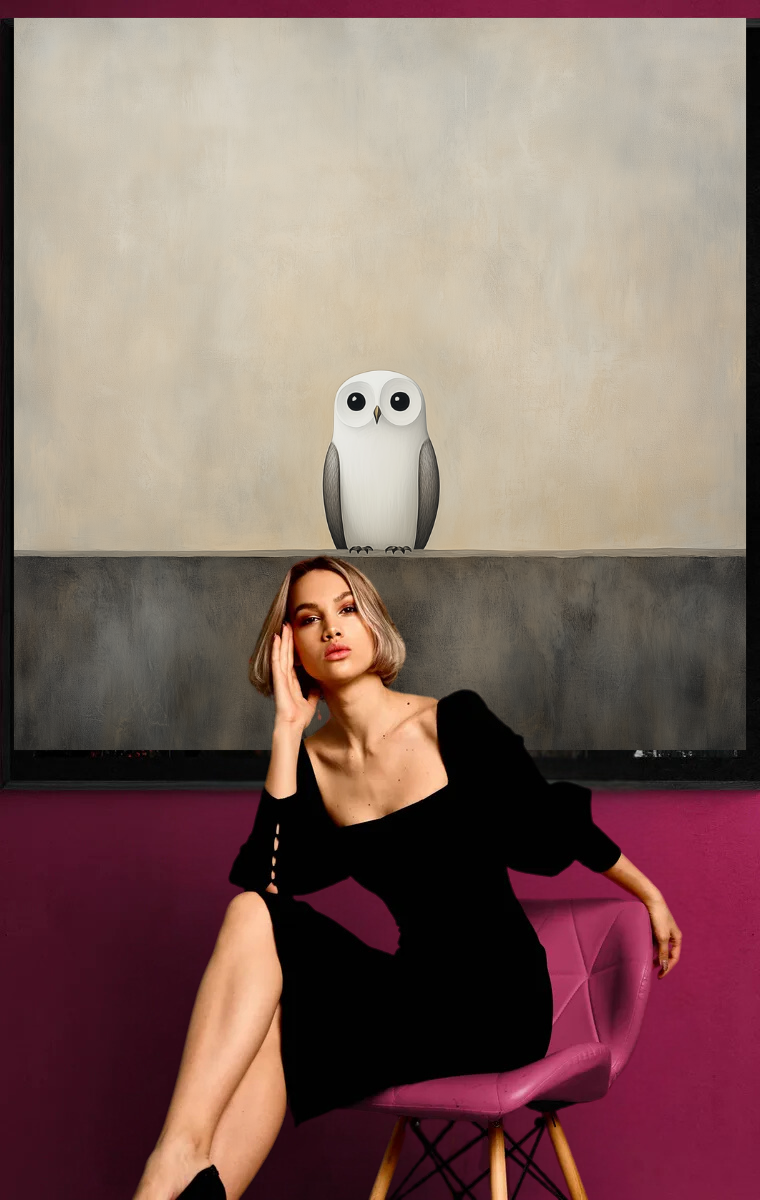 - Der dunkle Sockel: Der Sockel, auf dem die Eule sitzt, verleiht dem Bild eine solide Basis und hebt die Figur hervor, als wäre sie auf einer Bühne des Lebens, bereit, ihre stille Präsenz zu entfalten.