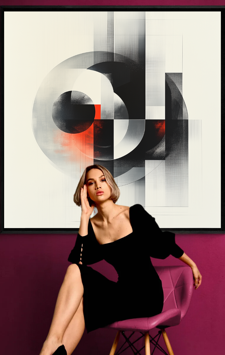„Kreis der Bewegung“ ist ein faszinierendes Spiel aus Formen, Kontrasten und subtilen Farbnuancen. Die fließenden Übergänge von Schwarz, Weiß und Grau werden durch Akzente in lebendigem Rot unterbrochen, die dem Werk Tiefe und Dynamik verleihen. Die klaren Linien und Kreise schaffen ein Gefühl von Harmonie und Bewegung, das den Blick immer wieder einfängt.