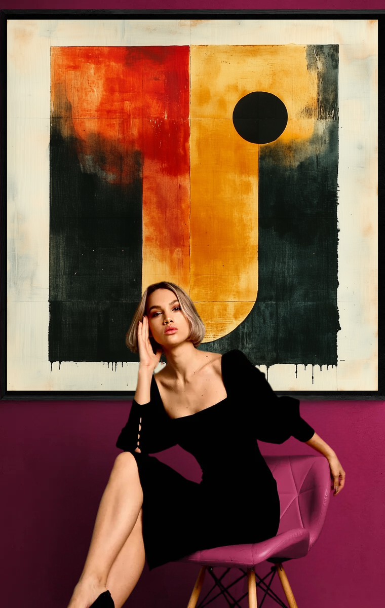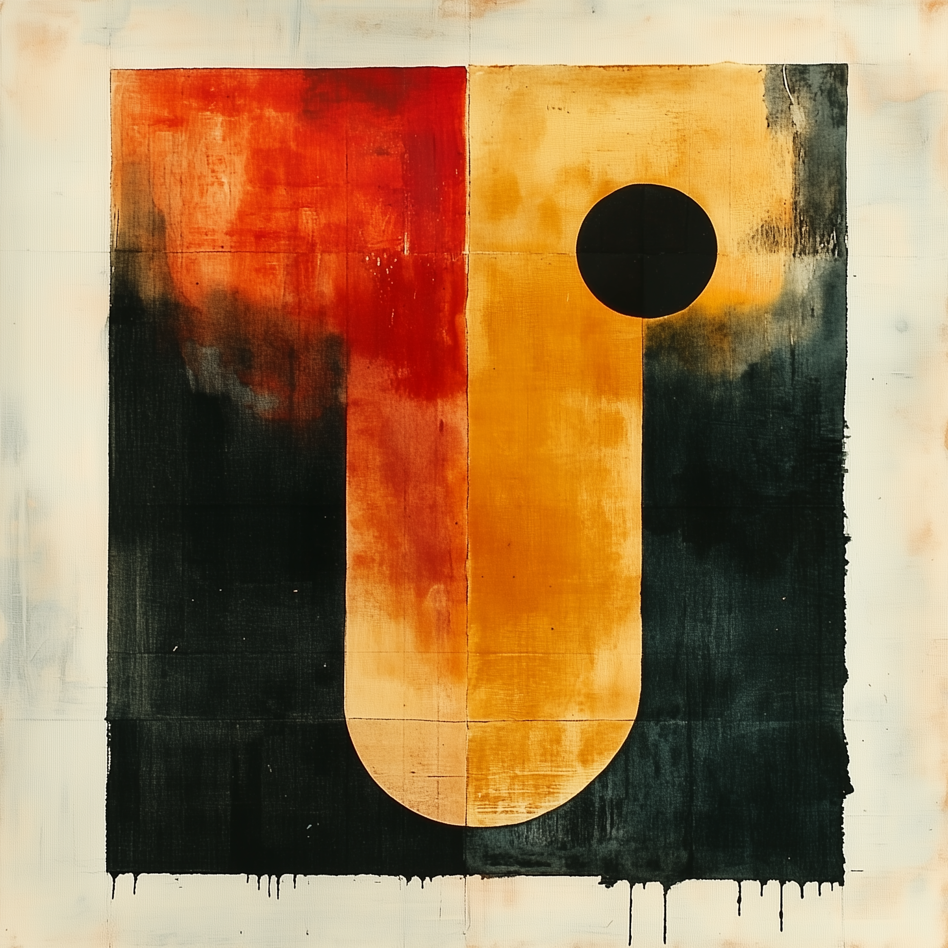 - Geteilte Farbflächen: Ein dramatischer Kontrast zwischen lebendigem Rot, warmem Gold und tiefem Schwarz.