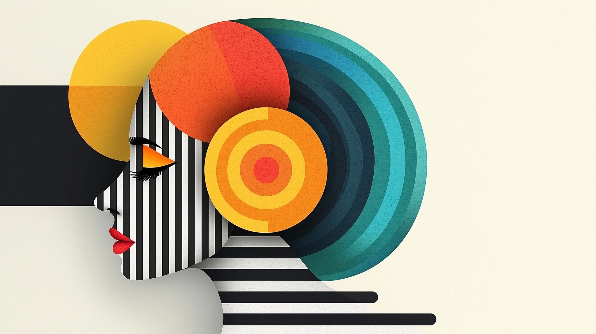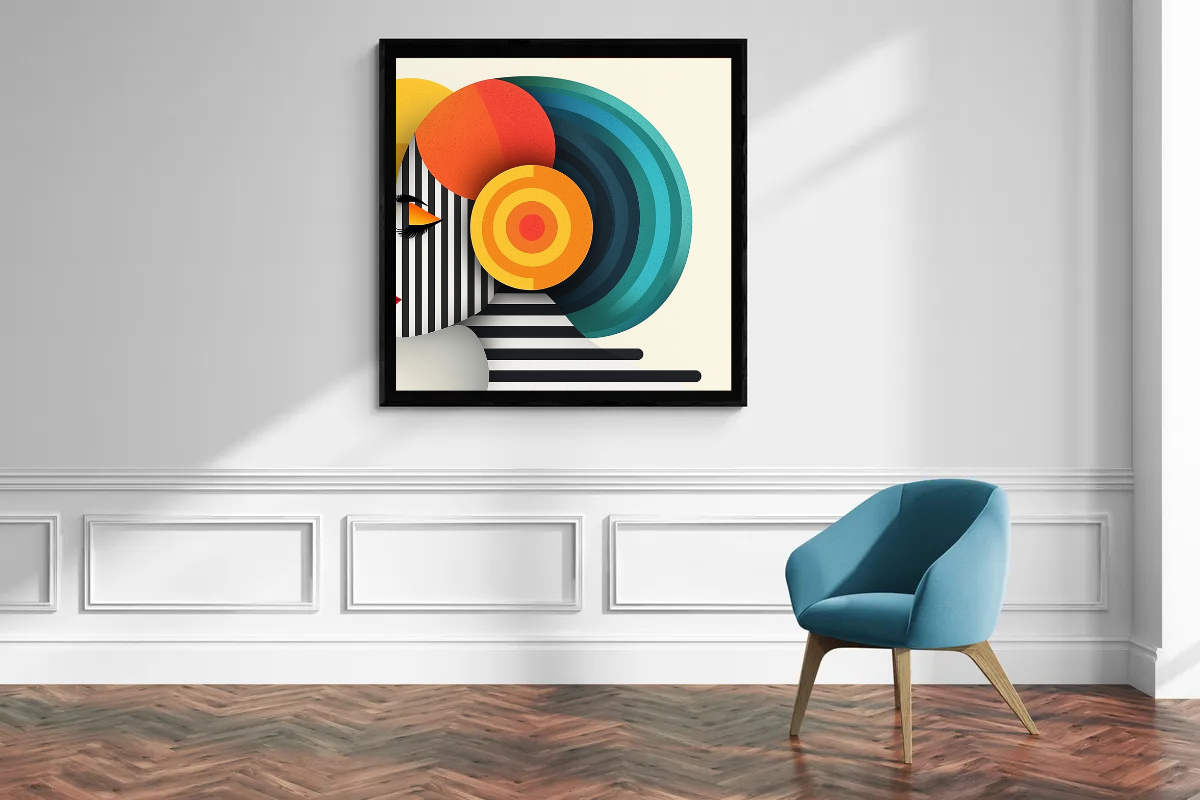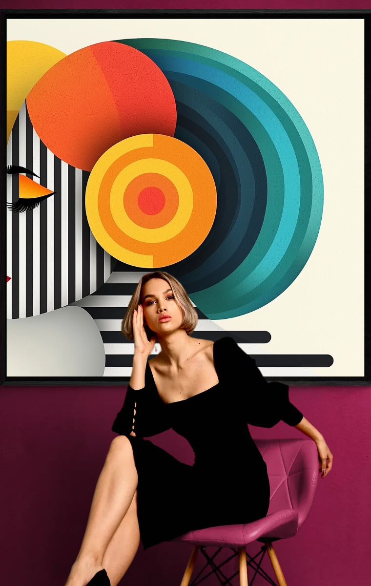 „Kreis der Farben“ ist ein faszinierendes Kunstwerk, das Linien und Formen zu einem lebendigen Porträt verbindet. Die stilisierte Silhouette, betont durch schwarz-weiße Streifen, wird von leuchtenden Kreisen in Gelb, Orange, Rot und Blau eingerahmt. Das harmonische Zusammenspiel von Farbschichten und grafischen Details schafft eine moderne und dynamische Ästhetik.