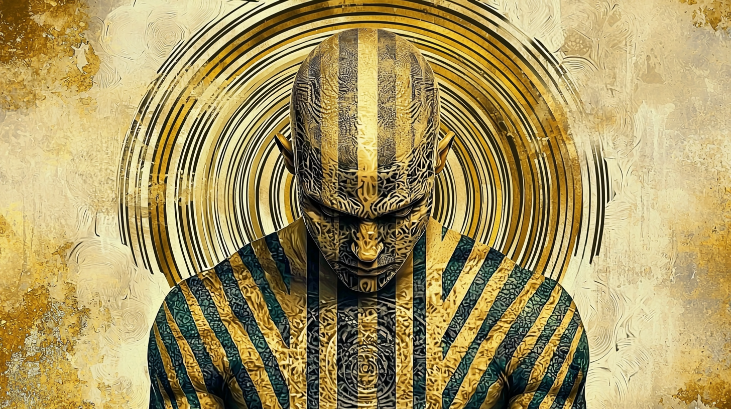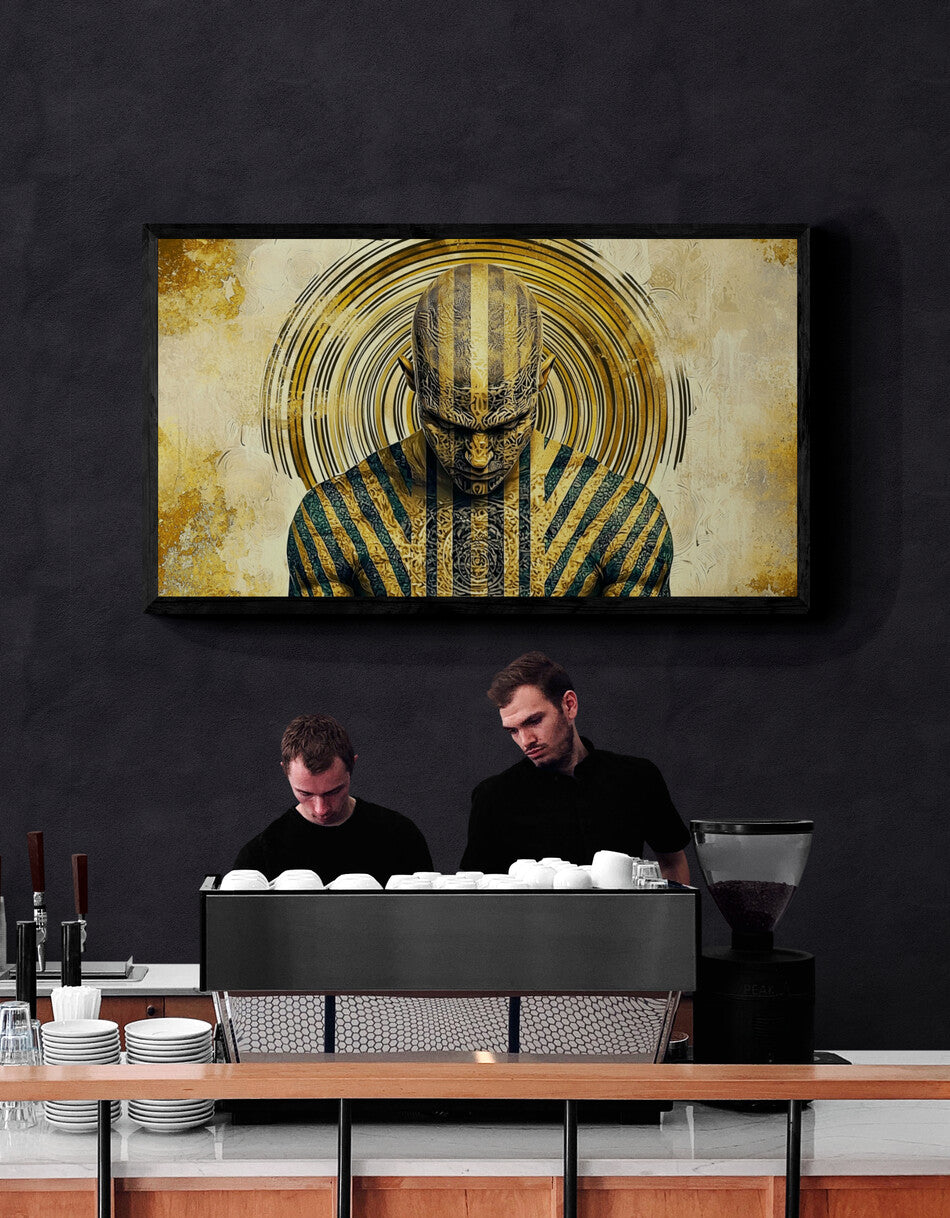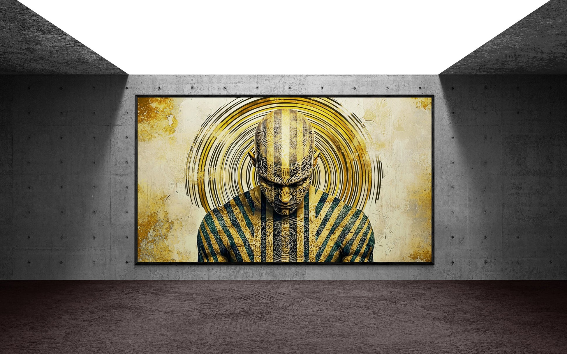 Die harmonische Balance aus goldenen und schwarzen Elementen hebt die zentrale Figur hervor und schafft eine visuelle Spannung, die den Betrachter fesselt.