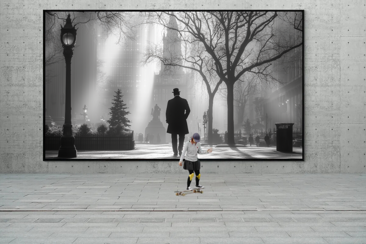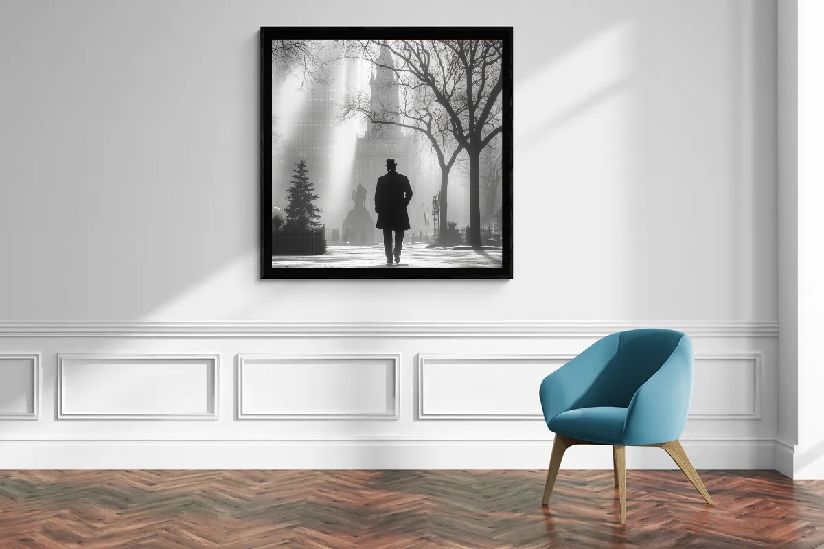 Dieses beeindruckende Kunstwerk fängt den magischen Moment ein, wenn die ersten Strahlen der Sonne die Stadt durchfluten und das Erwachen eines neuen Tages verkünden. „Morgen in der Stadt“ zeigt die Stille eines Parks, in dem ein einzelner Mann mit Würde und Ruhe durch die Szenerie schreitet.