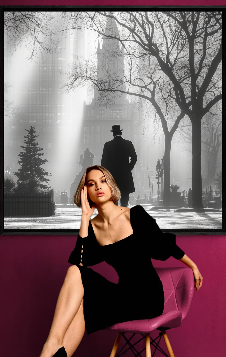 - Die gehende Silhouette: Mit Hut und Mantel gekleidet, repräsentiert sie Stil, Nachdenklichkeit und die Verbindung von Mensch und Stadt.