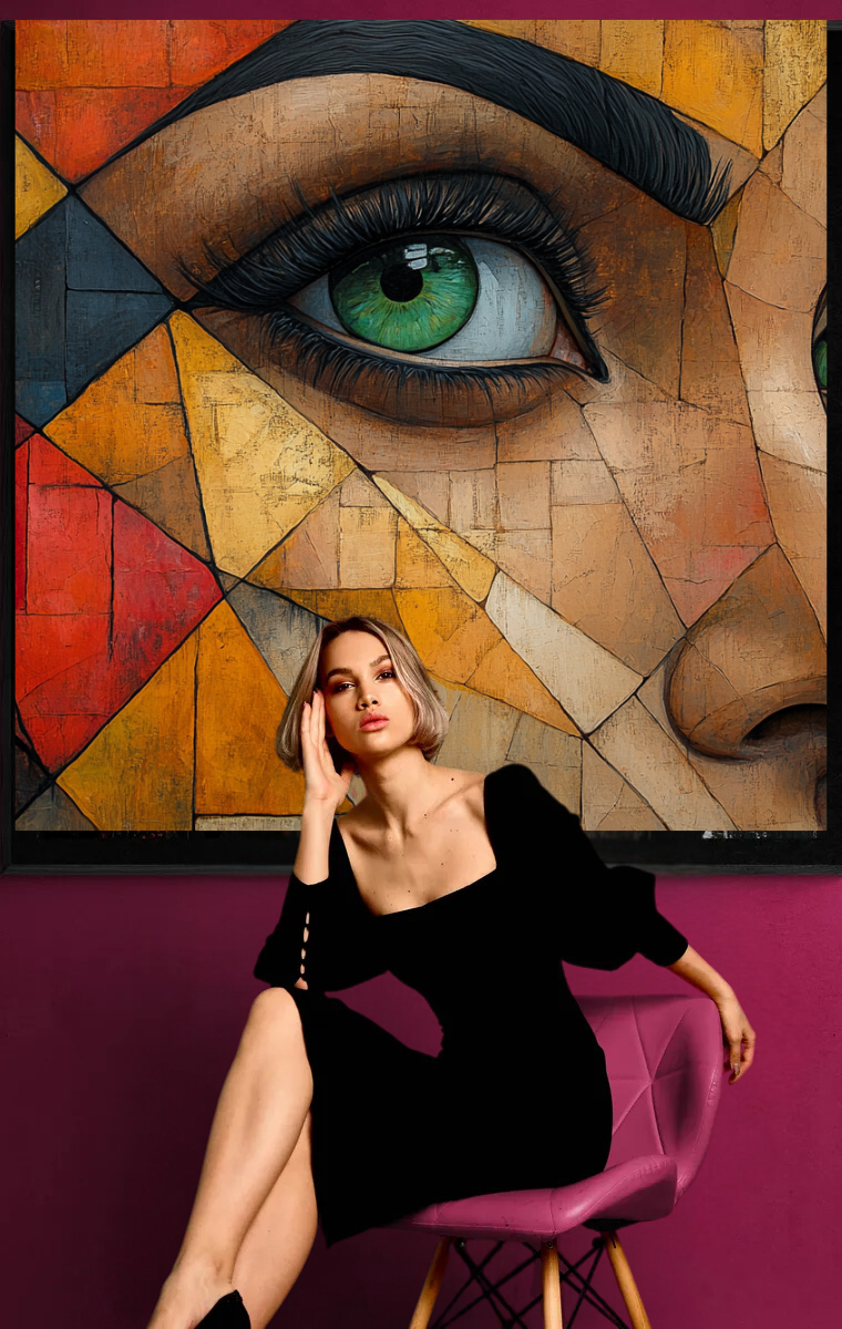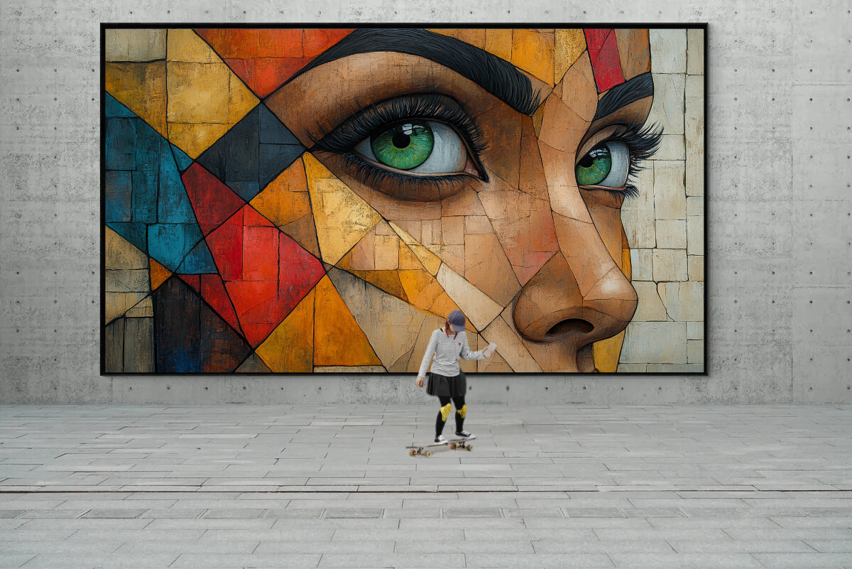 Mit „Mosaikblick“ verleihen Sie Ihrem Raum eine starke visuelle Präsenz und eine kunstvolle Aussage über die Komplexität und Schönheit des menschlichen Ausdrucks.
