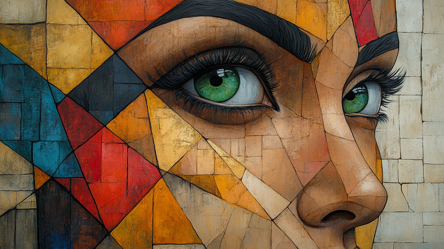 „Mosaikblick“ ist ein faszinierendes Kunstwerk, das die Tiefe und Ausdrucksstärke eines Gesichts durch eine komplexe Anordnung geometrischer Formen und Farben darstellt. Die intensiven grünen Augen ziehen den Betrachter sofort in ihren Bann, während die warmen Töne von Gelb, Rot und Blau einen lebendigen Kontrast schaffen und dem Bild eine dynamische Struktur verleihen. Das Mosaik-Design verstärkt die geheimnisvolle Aura und symbolisiert die vielen Facetten und Schichten der menschlichen Persönlichkeit.