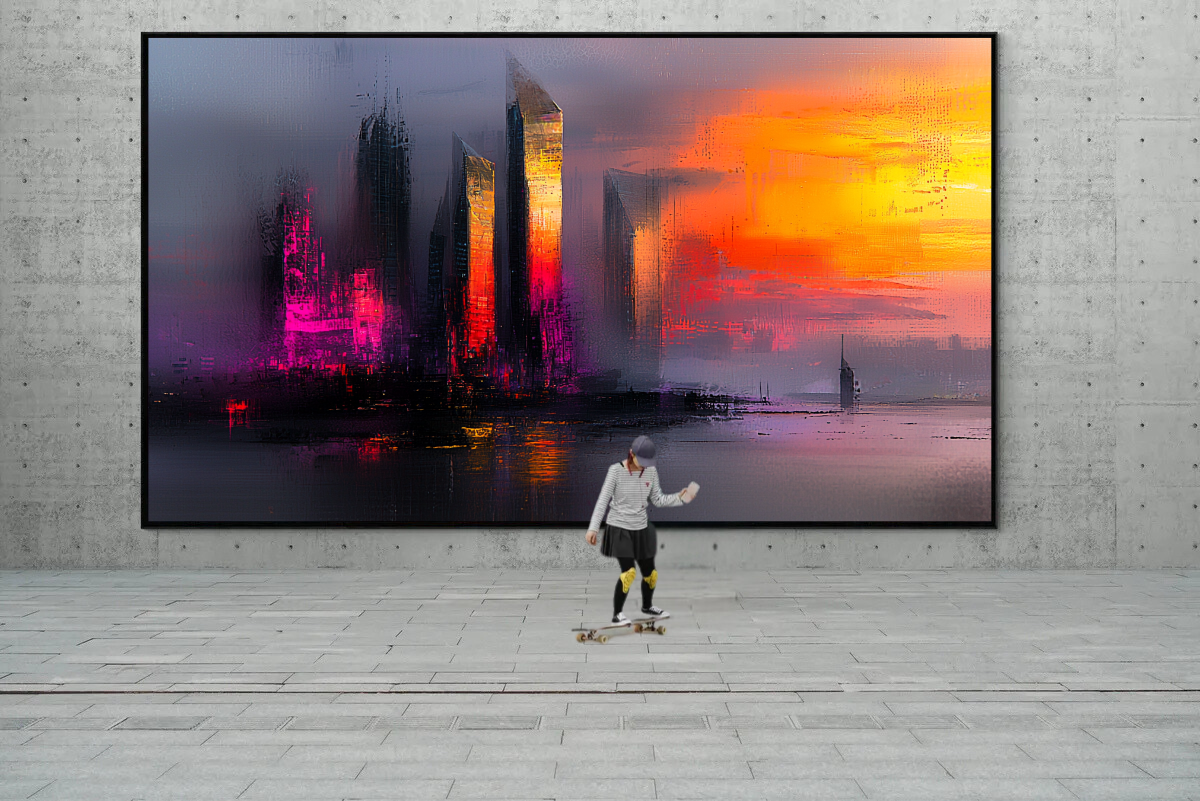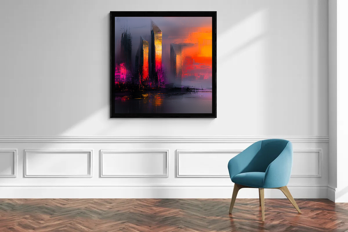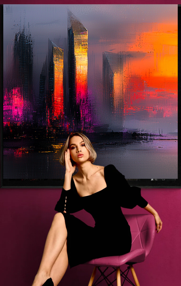 „Nachtlichter der Metropole“ fängt die geheimnisvolle Atmosphäre einer Stadt in der Dämmerung ein. Die dunklen Silhouetten der Hochhäuser werden von leuchtenden Akzenten in Pink und Orange durchzogen, die die Szenerie in ein dramatisches Licht tauchen. Der Himmel, in tiefen Lila- und Orangetönen gehalten, verstärkt die Stimmung und verleiht dem Kunstwerk eine intensive Ausstrahlung, die zugleich beruhigend und aufregend wirkt.