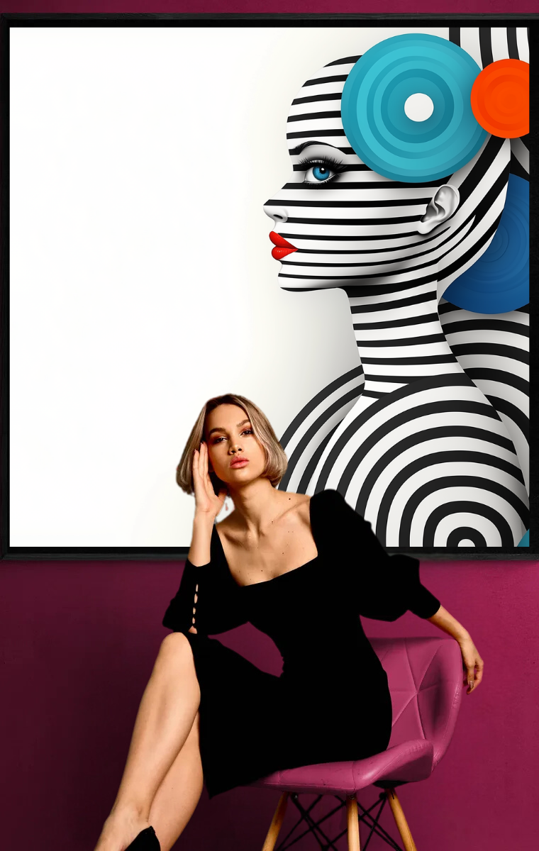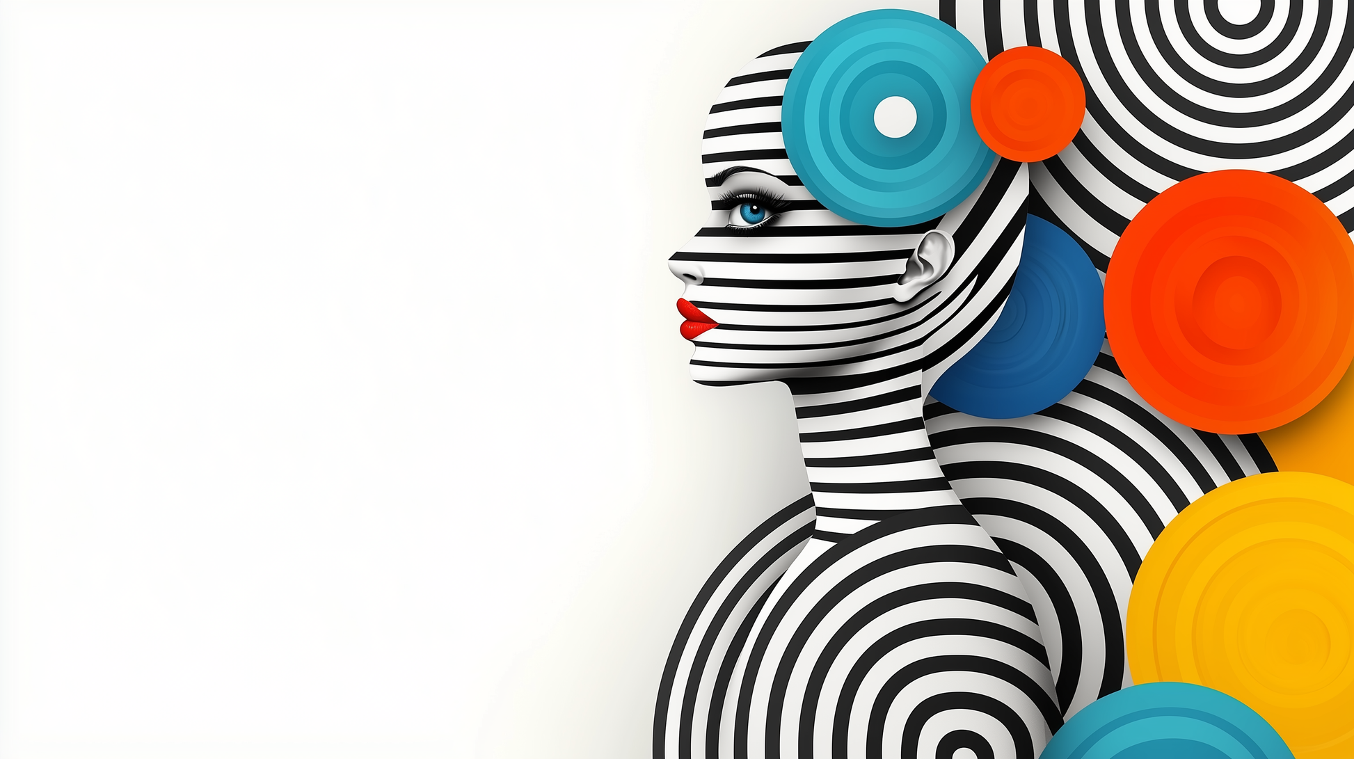 „Optische Harmonie“ vereint die Stärke monochromer Muster mit lebhaften Farbakzenten. Das Porträt einer stilisierten Figur, umgeben von hypnotischen schwarz-weißen Kreisen, wird durch leuchtende Highlights in Türkis, Orange, Blau und Gelb ergänzt. Die markanten roten Lippen und das ausdrucksstarke Auge verleihen dem Werk eine lebendige Dynamik.