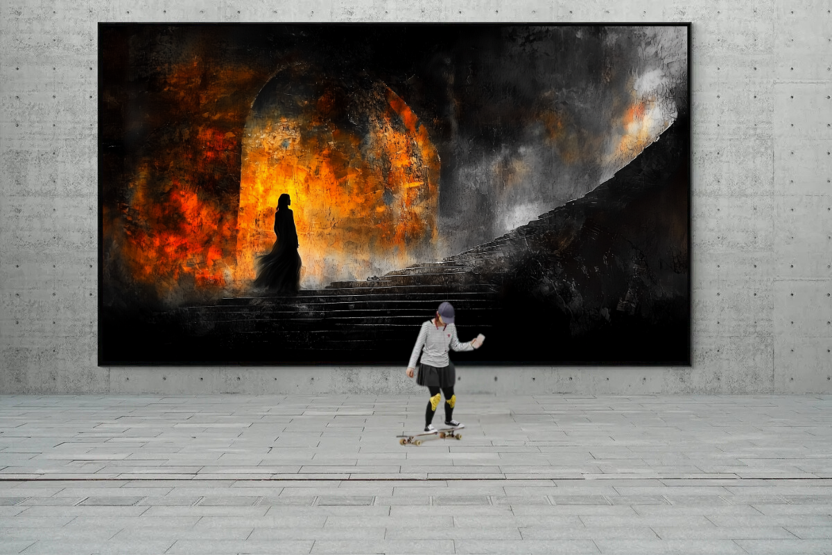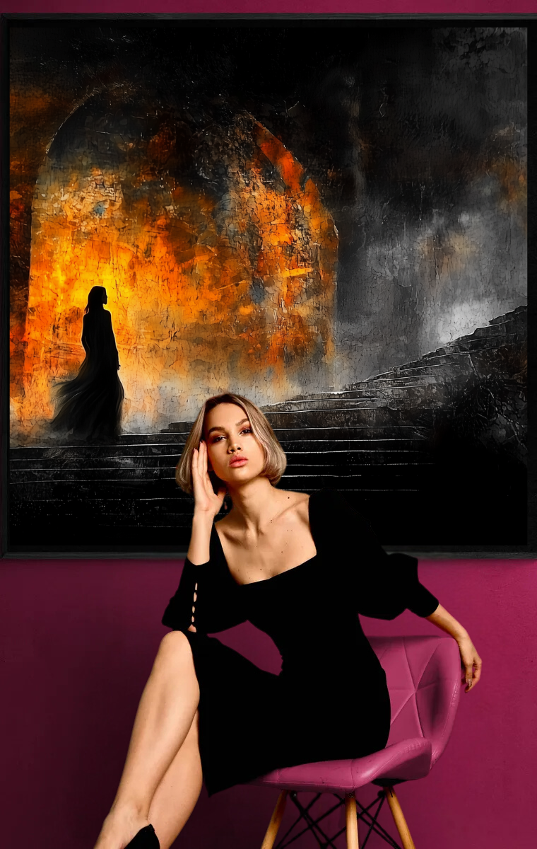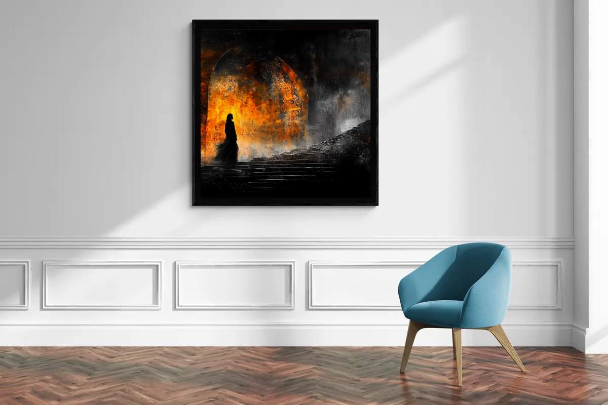 „Pfad ins Licht“ ist eine inspirierende Darstellung von Übergang und Wachstum. Es erinnert uns daran, dass Dunkelheit nicht das Ende bedeutet, sondern oft der Anfang eines neuen Kapitels ist. Die brennende Energie des Portals steht für den Durchbruch, der nach Momenten der Stille und Reflexion folgt.