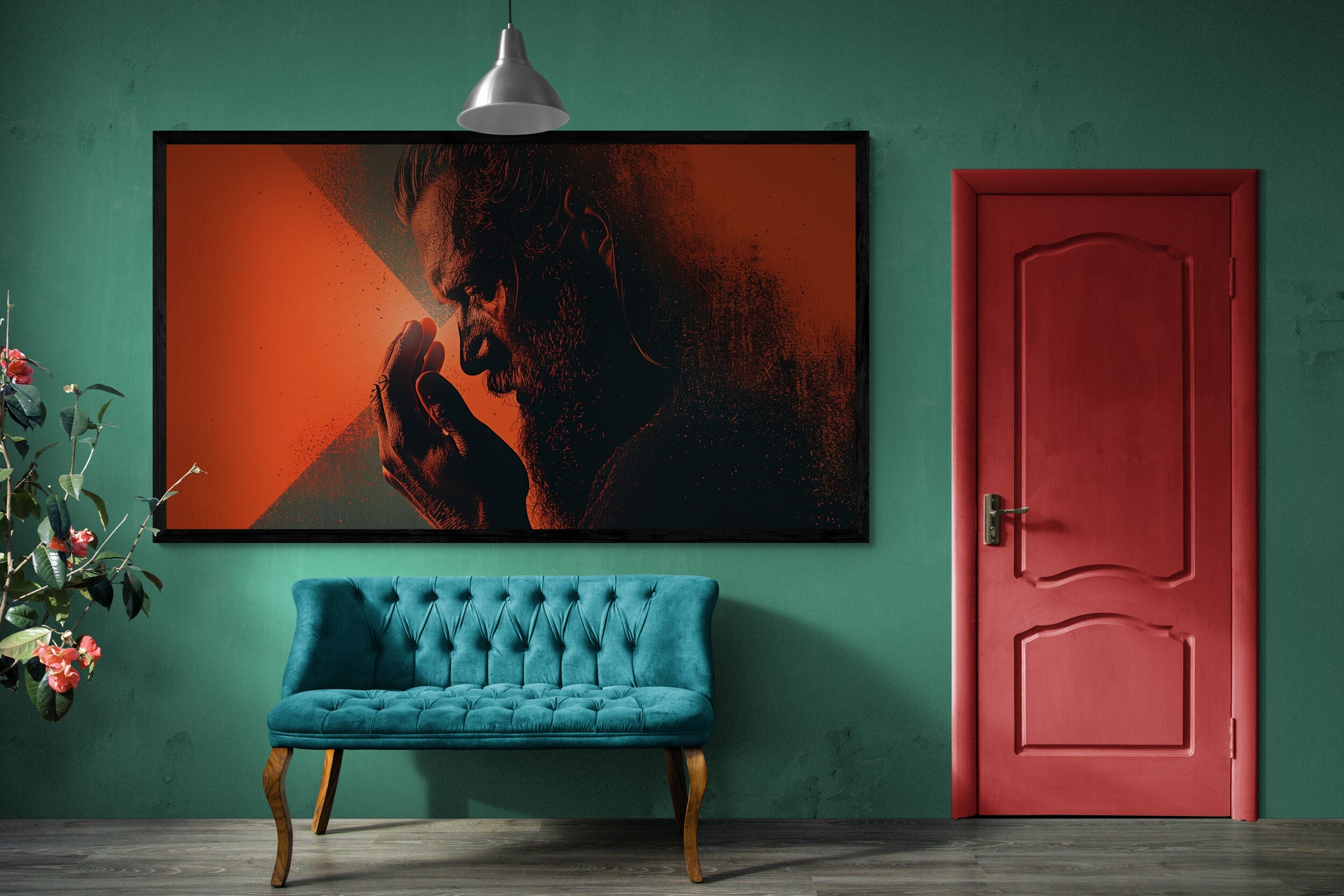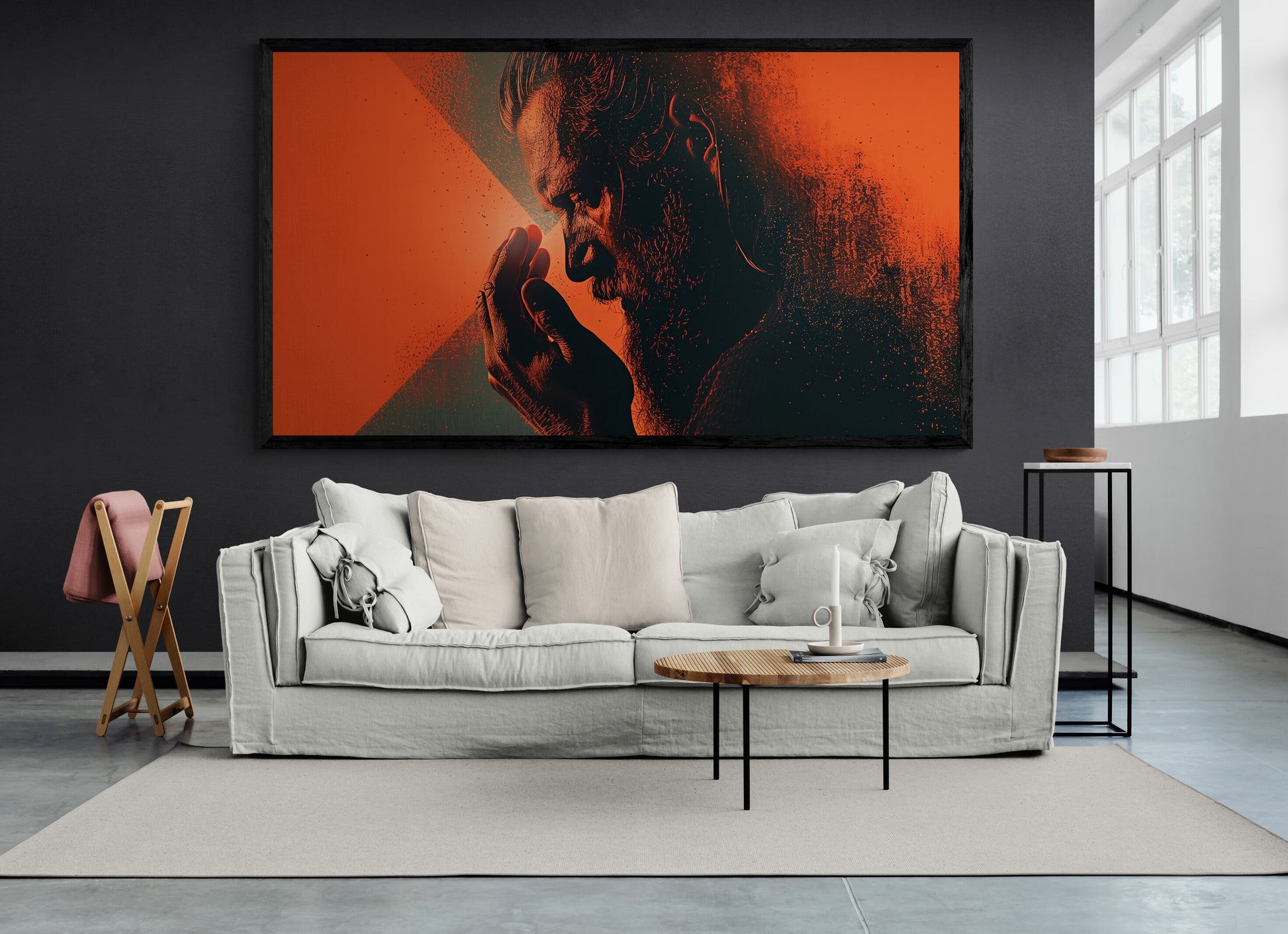 „Reflexion im roten Schein“ ist ein Kunstdruck -Motiv, das die Kraft stiller Einkehr in einem prägnanten Spiel aus Rot-Orange und tiefem Dunkel präsentiert. Ein Mann neigt seinen Kopf nachdenklich, während klare Linien und gezielte Farbakzente eine spannungsreiche Atmosphäre erzeugen. Dieses Werk lädt dazu ein, sich mit den eigenen Gedanken auseinanderzusetzen und die Intensität des Augenblicks zu spüren.