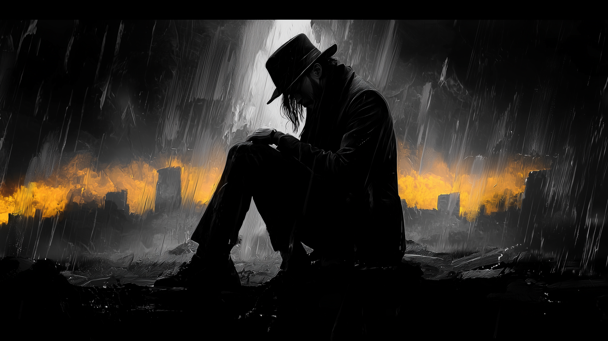 - Die Silhouette eines einsamen Mannes: Gekleidet in einem Mantel und Hut, symbolisiert er die Suche nach innerer Ruhe inmitten einer turbulenten Welt.