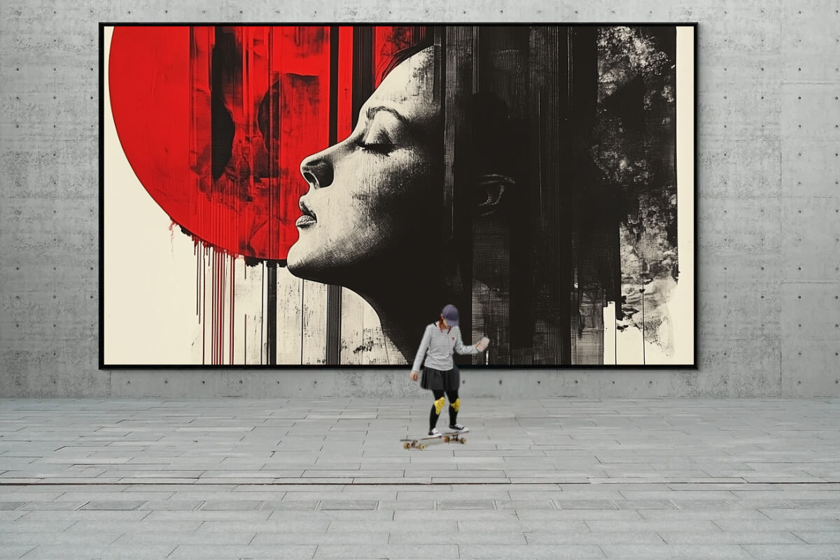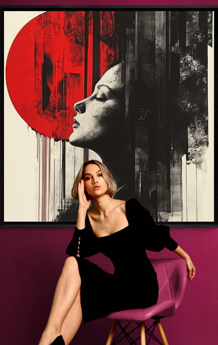 „Roter Mond“ ist ein kraftvolles abstraktes Porträt, das die Verbindung zwischen Mensch und universellen Emotionen einfängt. Die intensive rote Kugel, kombiniert mit der monochromen Silhouette, erzeugt eine faszinierende Balance aus Dramatik und Ruhe. Es ist eine Hommage an die Momente der Reflexion, die uns mit der Tiefe unserer Gefühle konfrontieren.