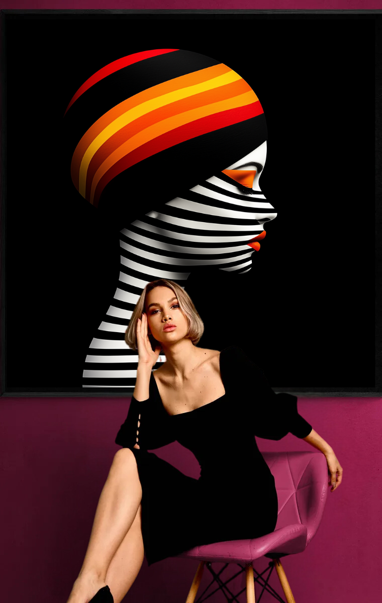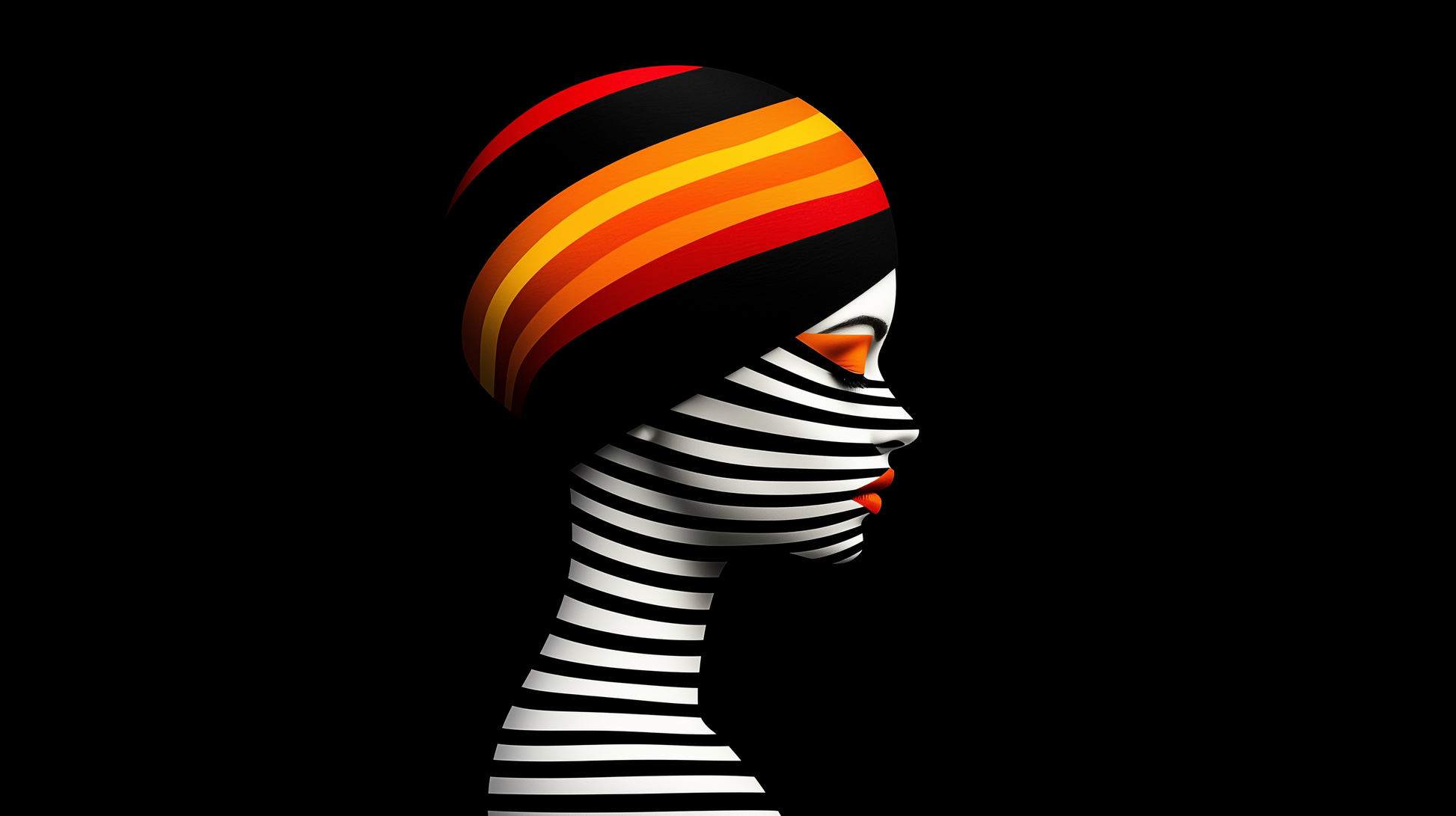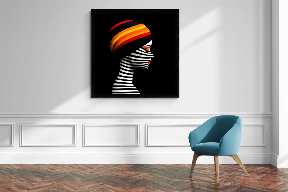 - Design : Profilansicht einer Silhouette mit dynamischen Schwarz-Weiß-Streifen, kombiniert mit einem kräftig gefärbten Kopfschmuck in Rot-, Gelb- und Orangetönen.