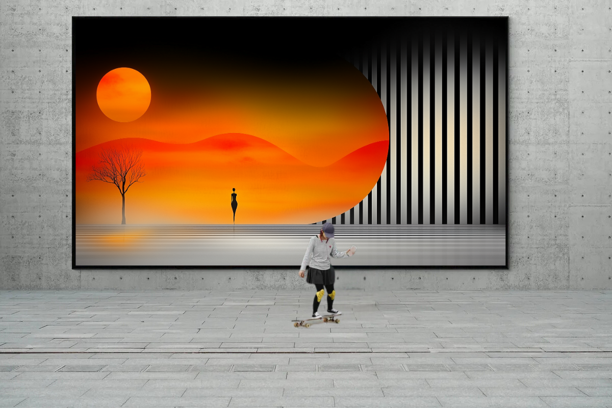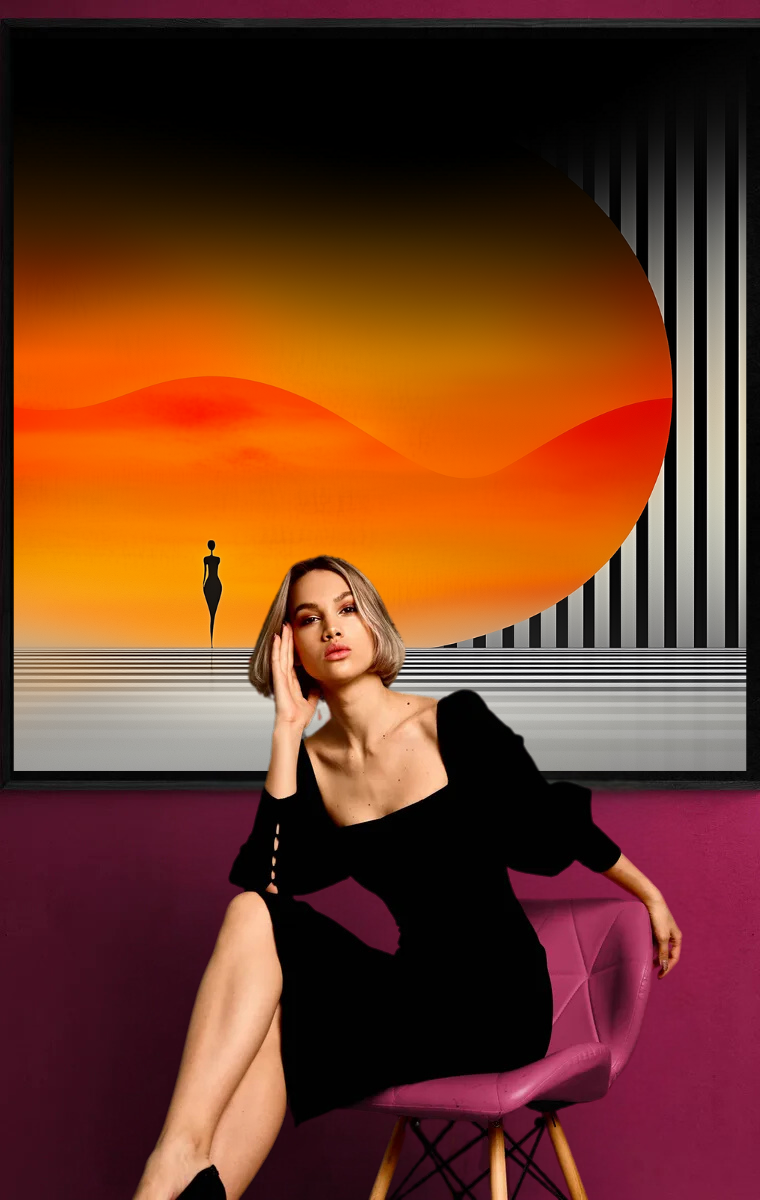 „Sonnenklang der Linien“ vereint die Wärme eines leuchtenden Sonnenuntergangs mit der Präzision geometrischer Muster. Dieses Kunstwerk erzählt eine Geschichte von Ruhe, Reflexion und der Verbindung zwischen der Natur und modernem Design.