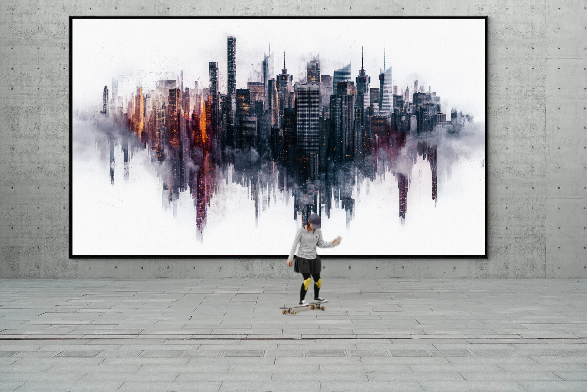 Dieses Kunstwerk ist ideal für Räume, die eine urbane, moderne Atmosphäre suchen. Es verbindet die Energie einer Großstadt mit einer einzigartigen, fast surrealen Perspektive und schafft eine faszinierende Tiefe.