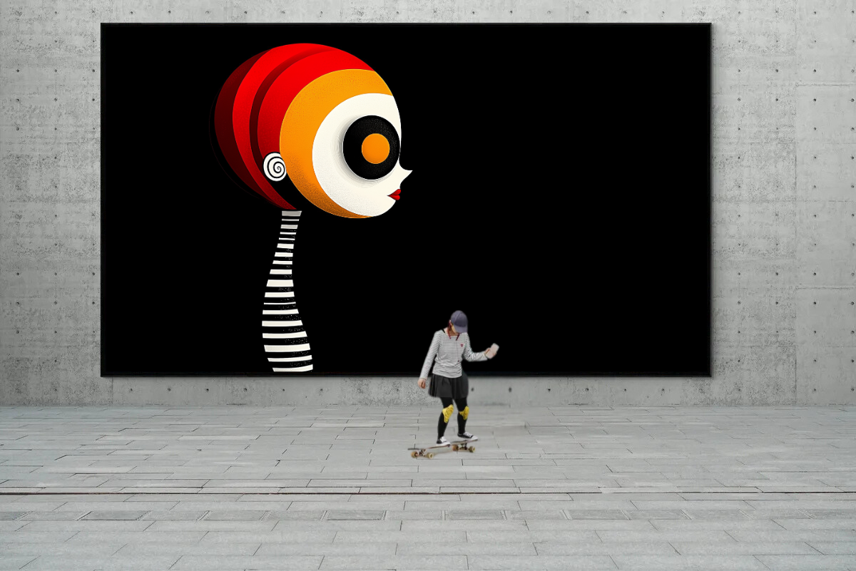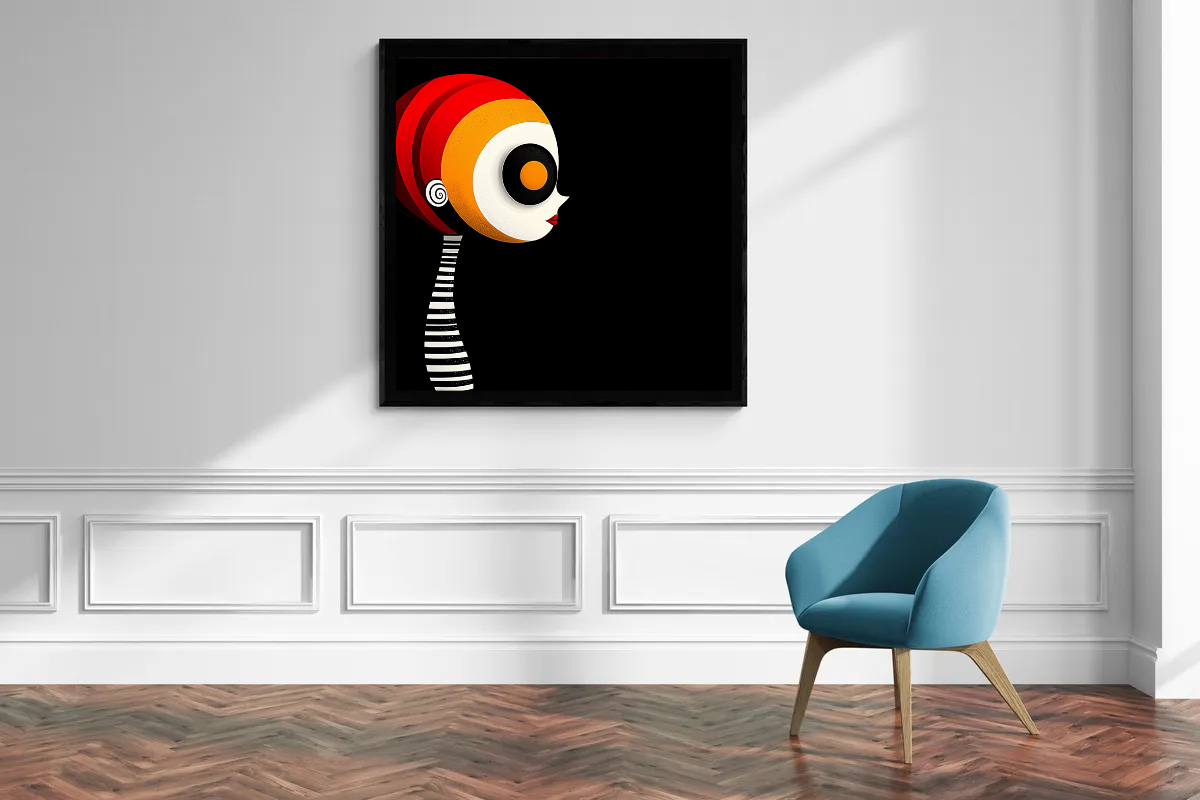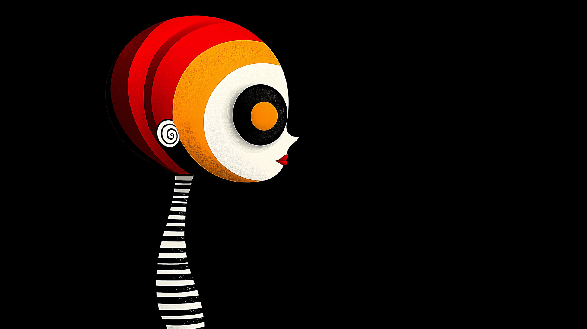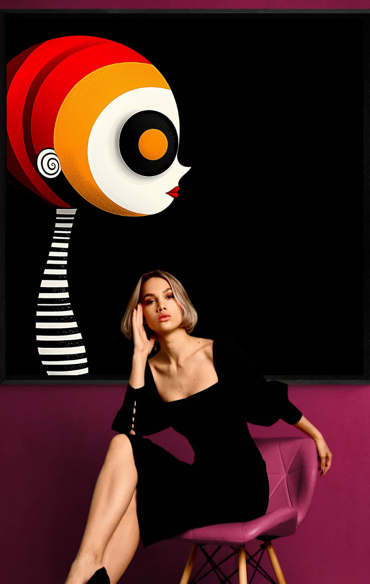 „Spirale der Fantasie“ ist ein eindrucksvolles Kunstwerk, das durch seine klare Komposition und lebendige Farbakzente besticht. Das stilisierte Profil mit einem spiralförmigen Ohr und einem Kopf in Schichten aus Rot, Orange und Gelb zieht den Blick sofort in eine Welt der Kreativität. Der schwarz-weiße, gestreifte Hals unterstreicht den minimalistischen und doch kraftvollen Charakter des Werkes.