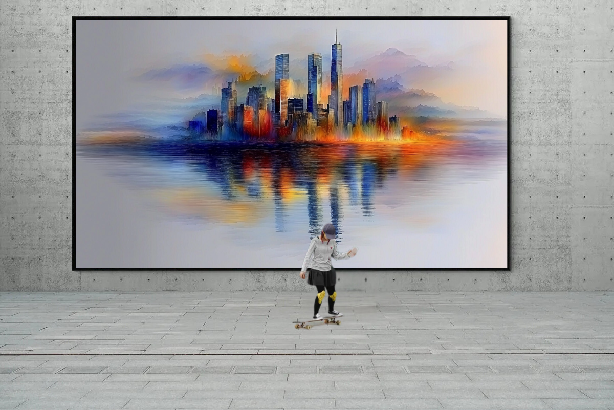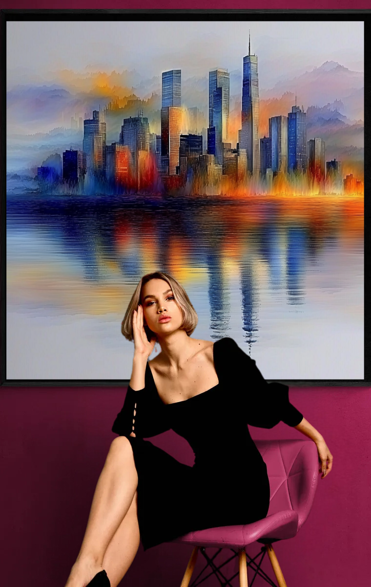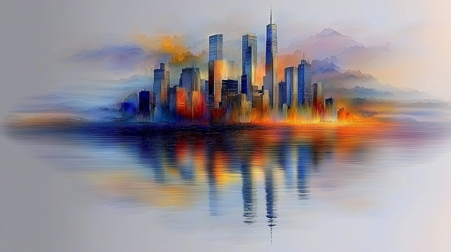 In dieser Komposition verschmilzt die Stadtlandschaft mit einem Nebel aus Farben, der sich weich und sanft über die Silhouette legt. Die Skyline erhebt sich majestätisch, eingefangen in Tönen, die von sanftem Blau und Orange bis hin zu warmem Rot reichen. Die Spiegelung im ruhigen Wasser verleiht dem Bild eine harmonische Tiefe, während der feine Farbverlauf im Hintergrund wie sanfte Berge wirkt, die der Stadt Ruhe und Geborgenheit geben.