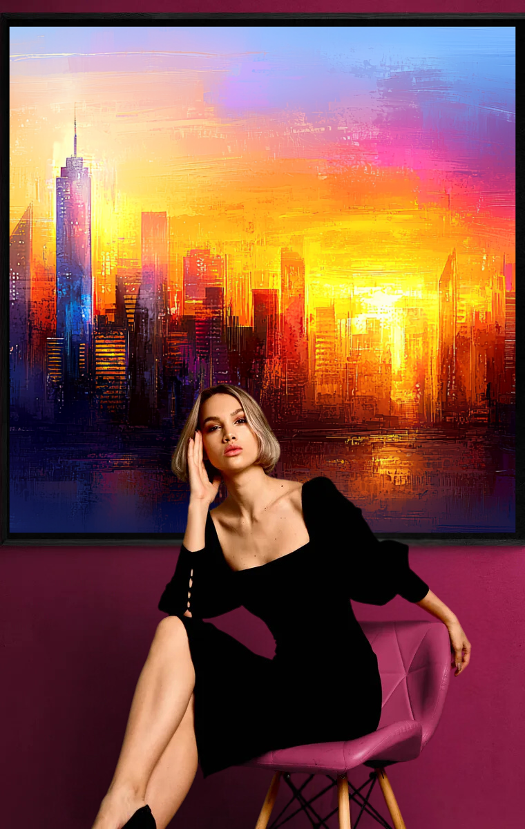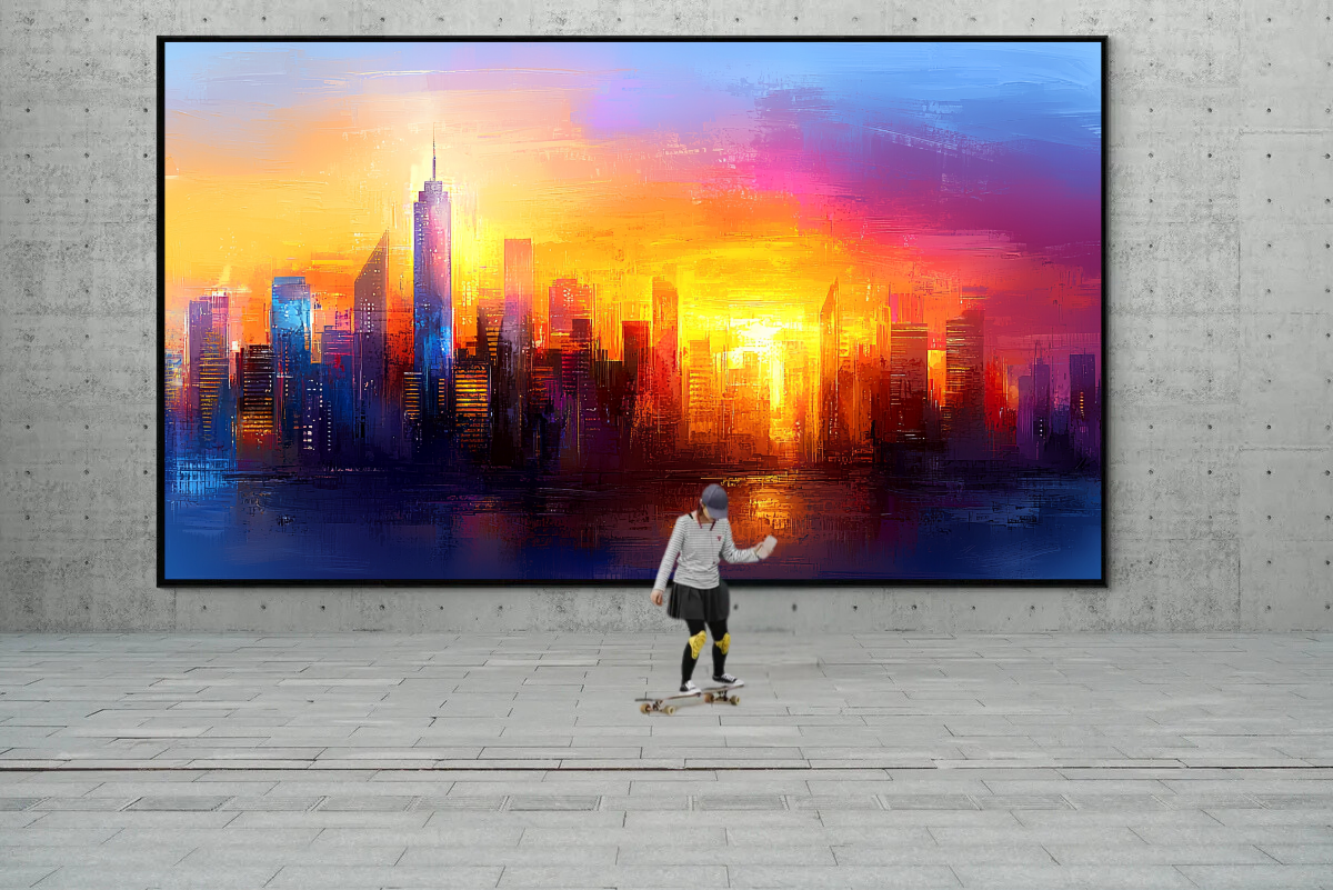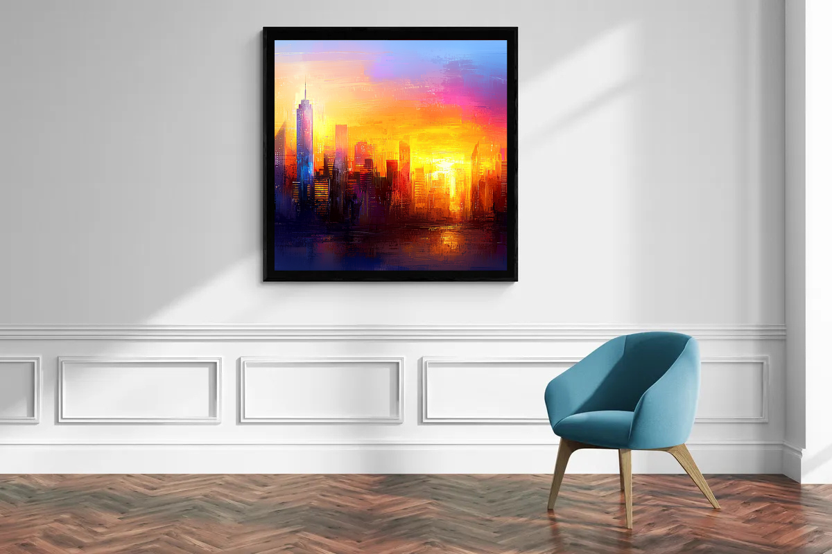 In diesem Bild erhebt sich eine leuchtende Skyline in lebhaften Farben gegen einen glühenden Himmel. Die warme, goldene Sonne durchbricht das Blau des frühen Morgens, taucht die Gebäude in intensive Gelb-, Orange- und Violetttöne und lässt die moderne Architektur in einem magischen Licht erscheinen. Die tiefen, satten Blautöne im Vordergrund verstärken den Kontrast und verleihen der Szene eine geheimnisvolle Tiefe.