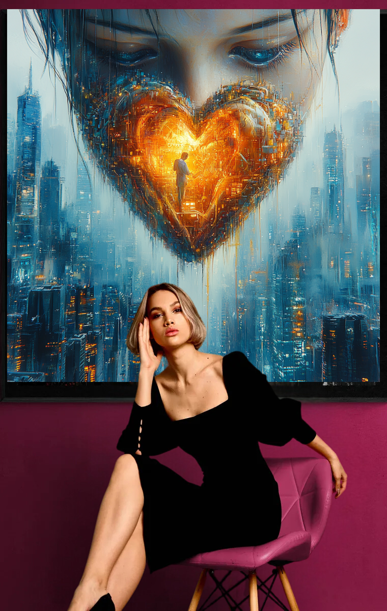 Dieses Bild spricht besonders Liebhaber futuristischer und cyberpunk-inspirierter Kunst an und bringt eine geheimnisvolle, emotionale Atmosphäre in jeden Raum. „Stadt des Herzens“ zeigt die Zerbrechlichkeit und Schönheit des menschlichen Inneren, verborgen in einer Welt aus Technologie und städtischer Kälte.