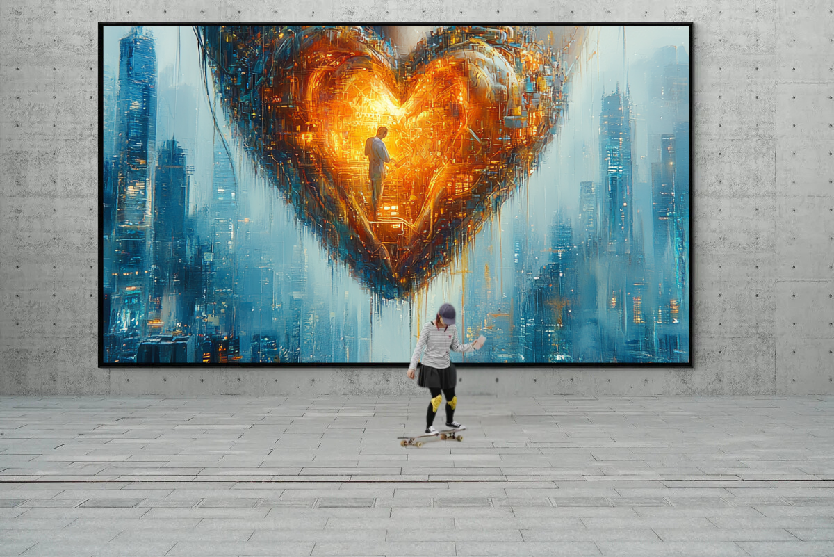 Mit „Stadt des Herzens“ holen Sie sich ein Stück emotionaler, futuristischer Kunst nach Hause, das zum Nachdenken und Träumen anregt.