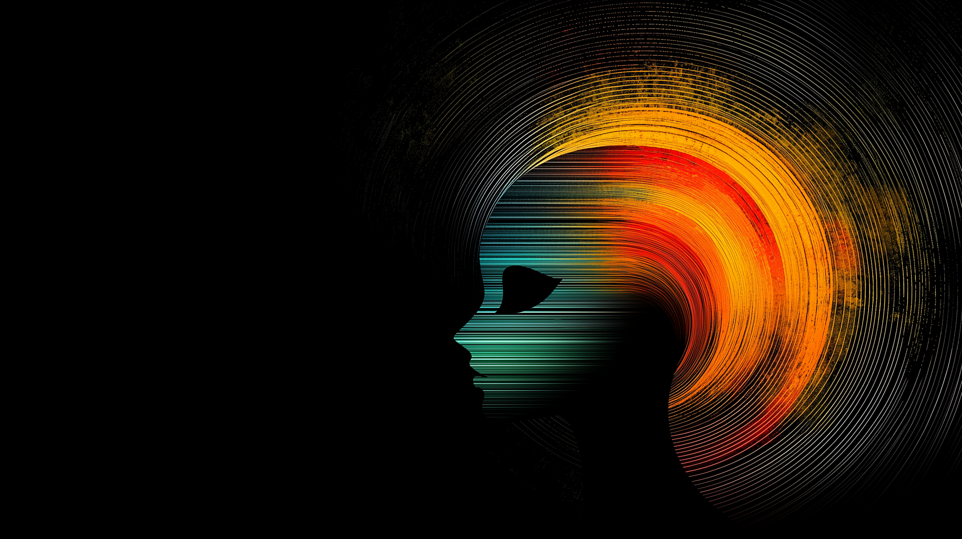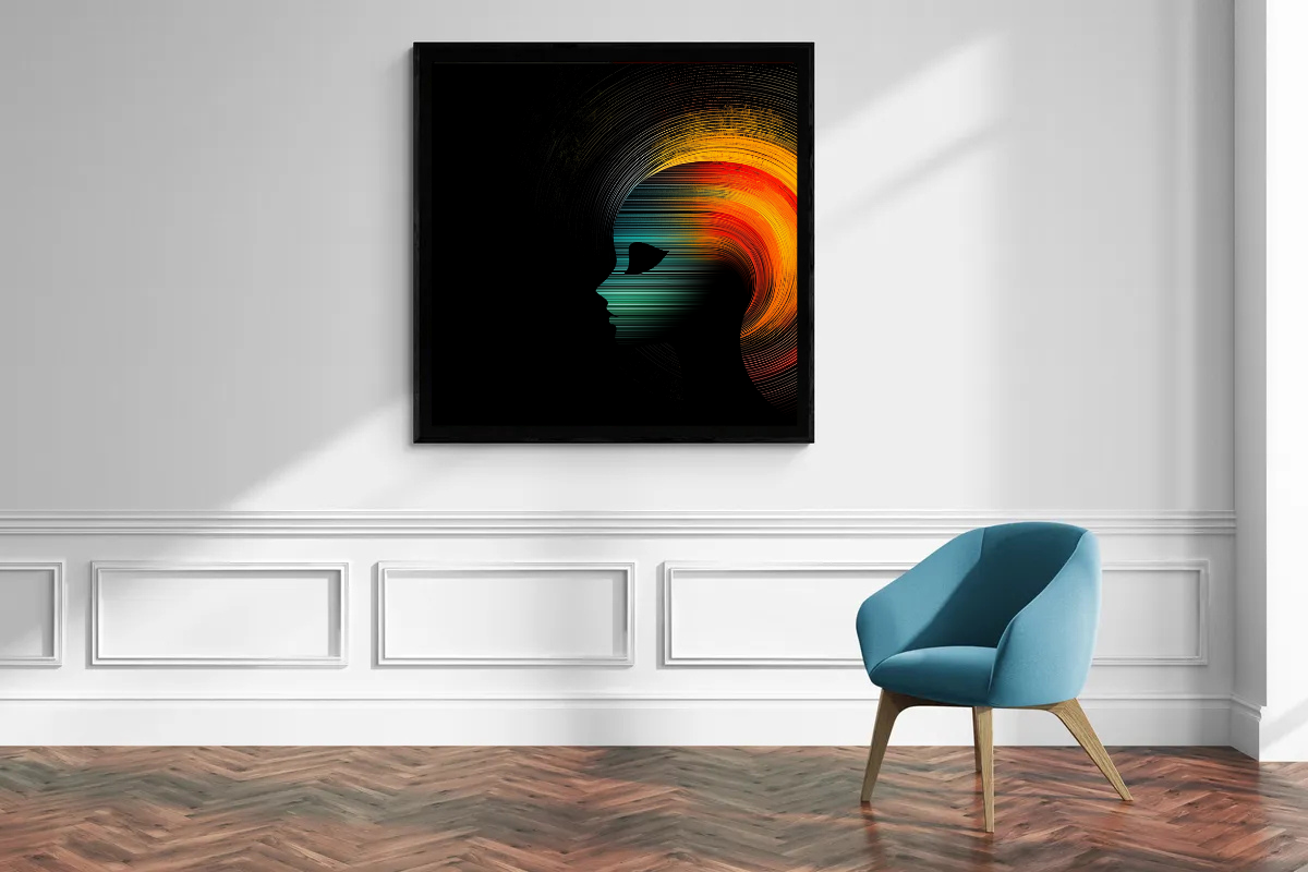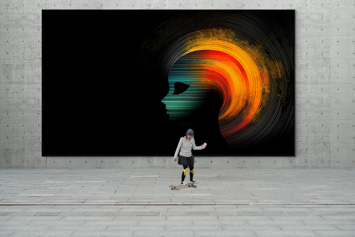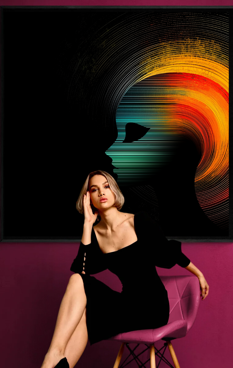 - Komposition : Im Zentrum steht das Profil einer Silhouette, die nahtlos in eine Farbspirale übergeht. Die Kreise symbolisieren innere Reflexion und Expansion.
