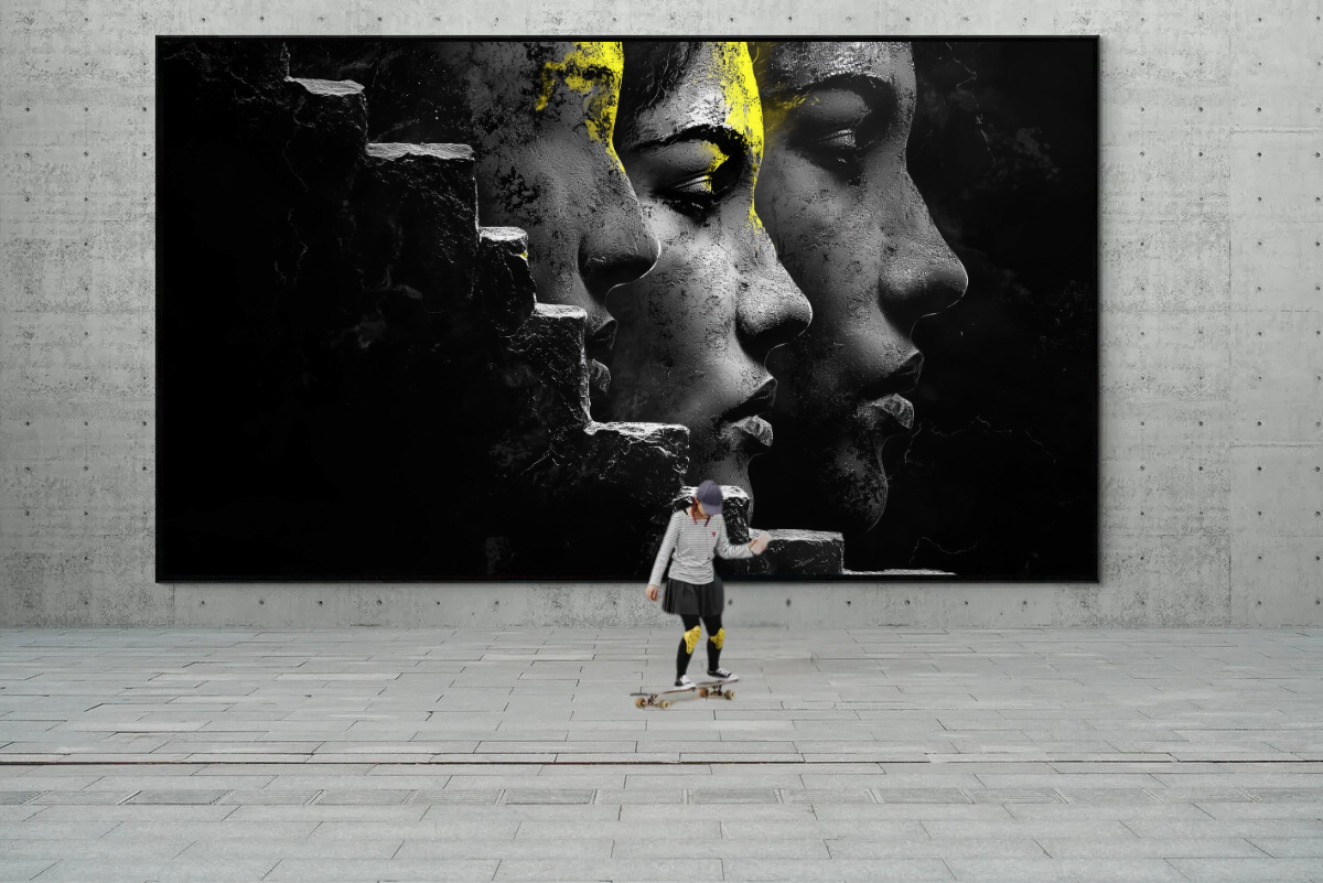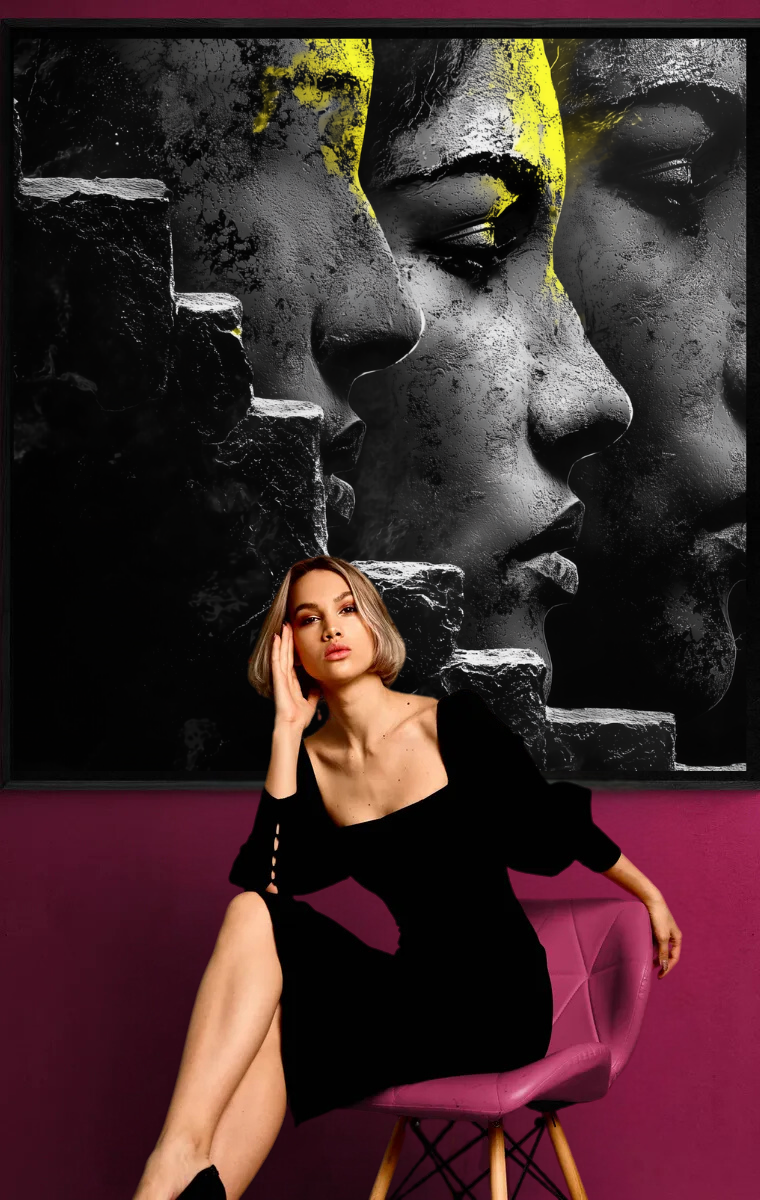 - Symbolismus: Die Kombination aus Gesichtern, Stufen und Texturen erzählt eine kraftvolle Geschichte von Identität und Transformation.