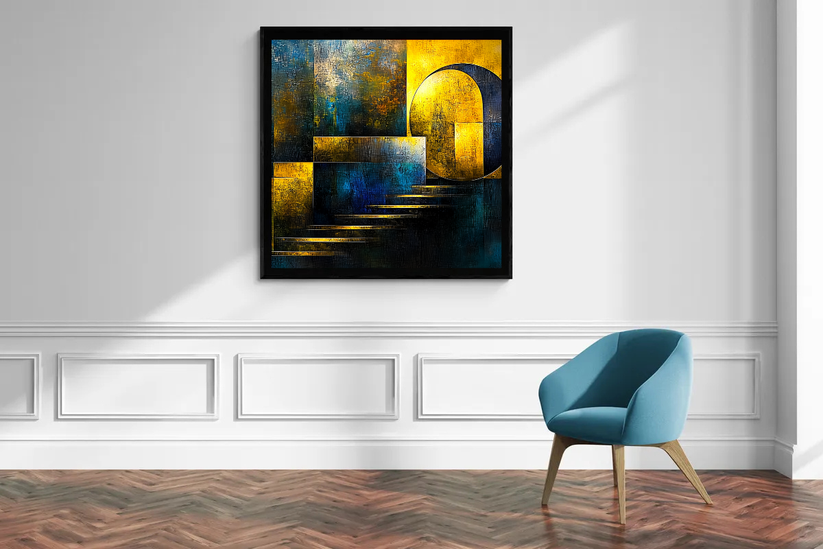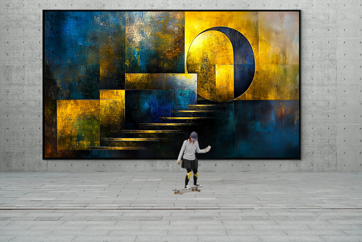 „Stufen zur Ewigkeit“ ist ein modernes abstraktes Meisterwerk, das die Harmonie zwischen Geometrie, Farbe und Licht erkundet. Es zieht den Betrachter mit einer Kombination aus kühler Ruhe und strahlender Wärme in eine Welt, die sowohl architektonisch als auch mystisch anmutet.