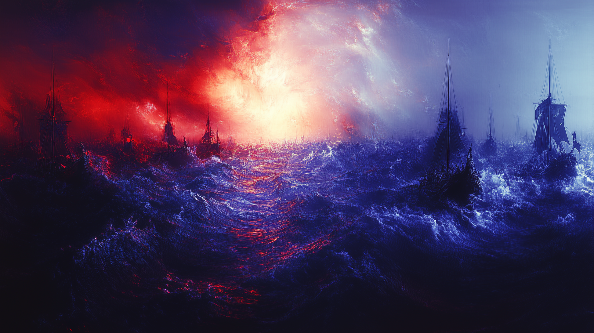 - Die Flotte: Dunkle Silhouetten von Schiffen, die sich der tobenden See und dem brennenden Horizont entgegenstellen. Sie symbolisieren Entschlossenheit und Widerstandsfähigkeit.