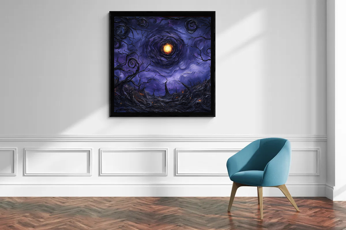 Mit „Tanz der verdorrten Zweige“ holen Sie ein Stück der geheimnisvollen Magie der Nacht in Ihre Räume. Es ist ein Kunstwerk, das sowohl optisch fesselt als auch eine tiefe, poetische Botschaft trägt – eine Einladung, das Licht in der Dunkelheit zu entdecken.