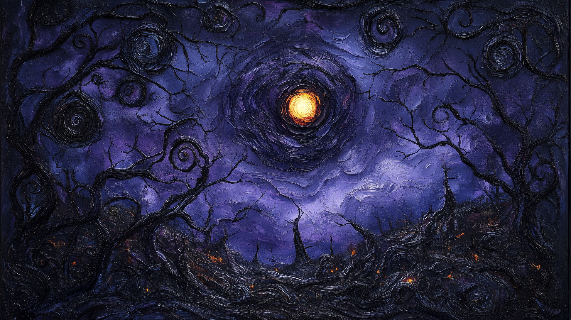 - Verdorrte, gewundene Äste: Sie scheinen sich nach dem Licht zu strecken und zu verkörpern die unaufhörliche Suche der Natur nach Leben und Energie. Die Äste sind wie tanzende Hände, die in die Nacht hineinragen.