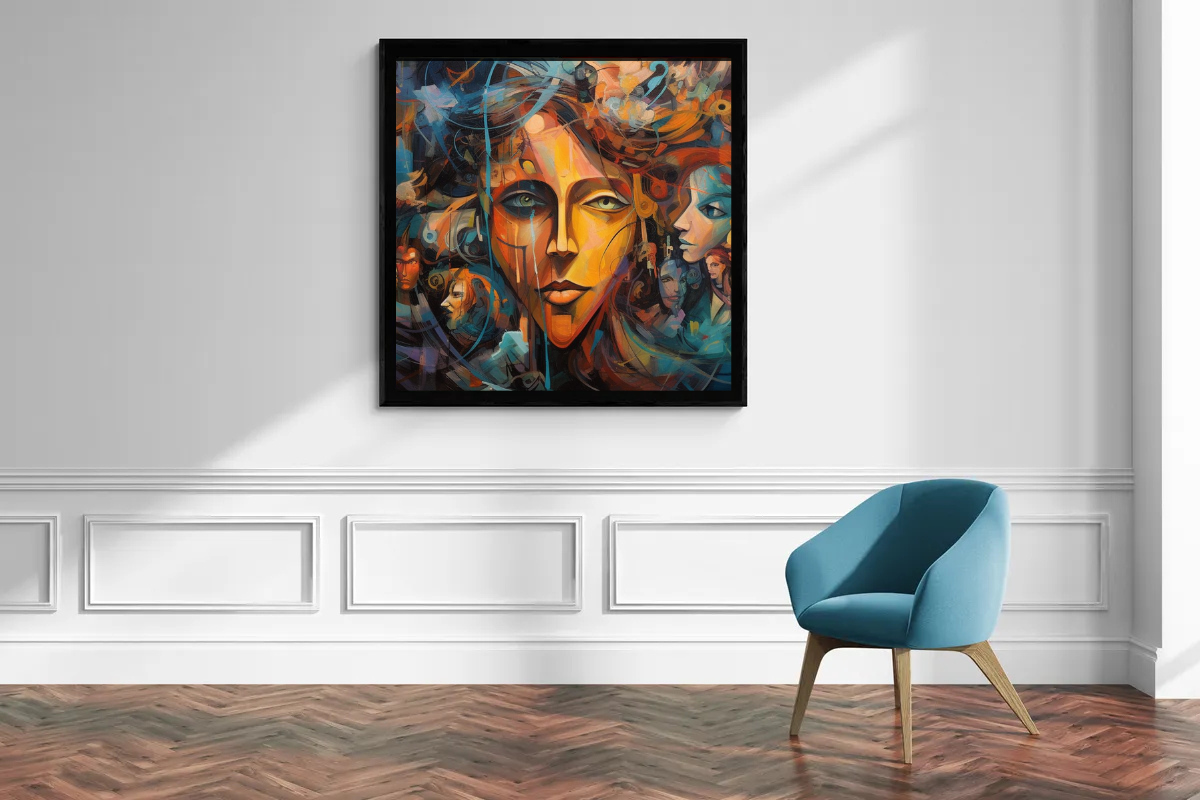 „Träume in Farbe“ ist ein einzigartiger Kunstdruck, der die Tiefen des Unterbewusstseins in einer lebhaften und surrealistischen Komposition darstellt. Im Zentrum steht ein intensiver Blick, der den Betrachter in eine Welt voller Gesichter, Formen und Farben zieht – eine chaotische, aber zugleich faszinierende Szenerie, die das Innenleben und die Träume eines Menschen widerspiegelt. Die kontrastreichen Farbströme in Blau-, Orange- und Gelbtönen verleihen dem Bild eine hypnotische Dynamik und laden zur Interpretation ein.