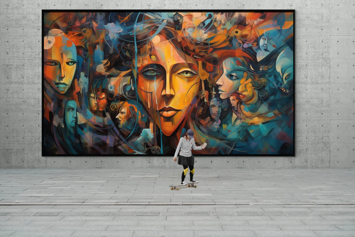 Jedes Detail und jede Figur scheint ihre eigene Geschichte zu erzählen und fügt sich in das größere, surreale Puzzle ein. Diese kunstvolle Darstellung der menschlichen Psyche ist perfekt für Räume, die eine lebendige, inspirierende Atmosphäre schaffen möchten.