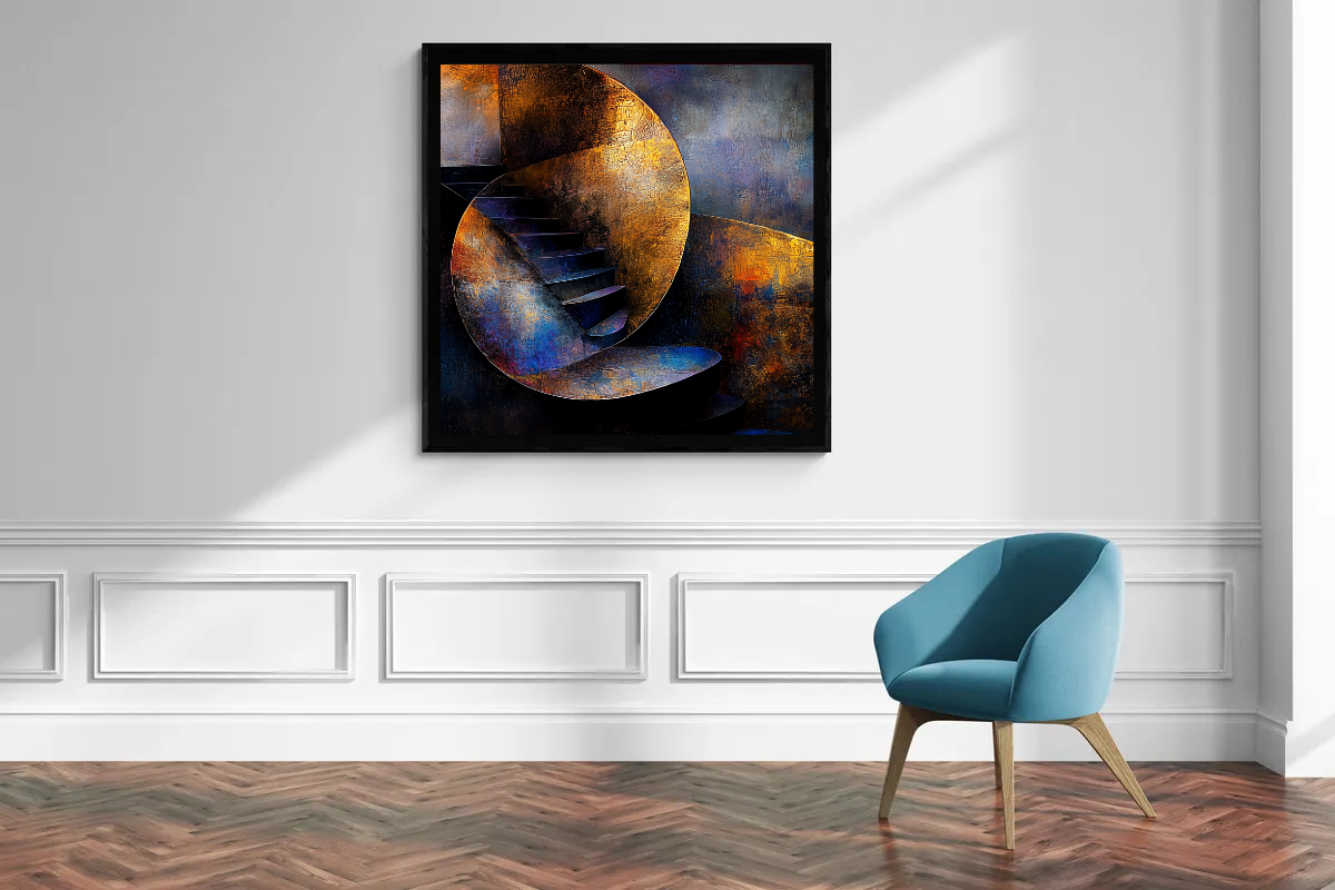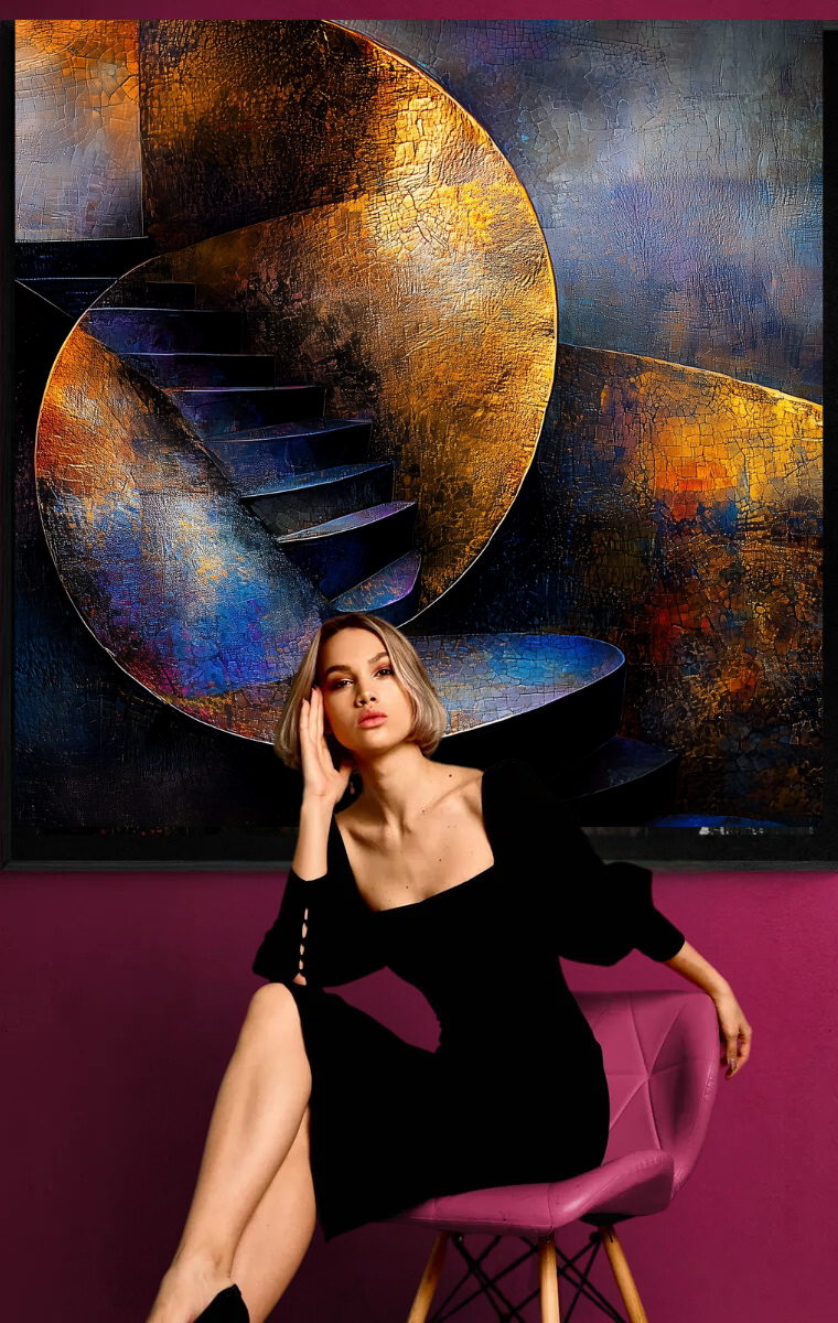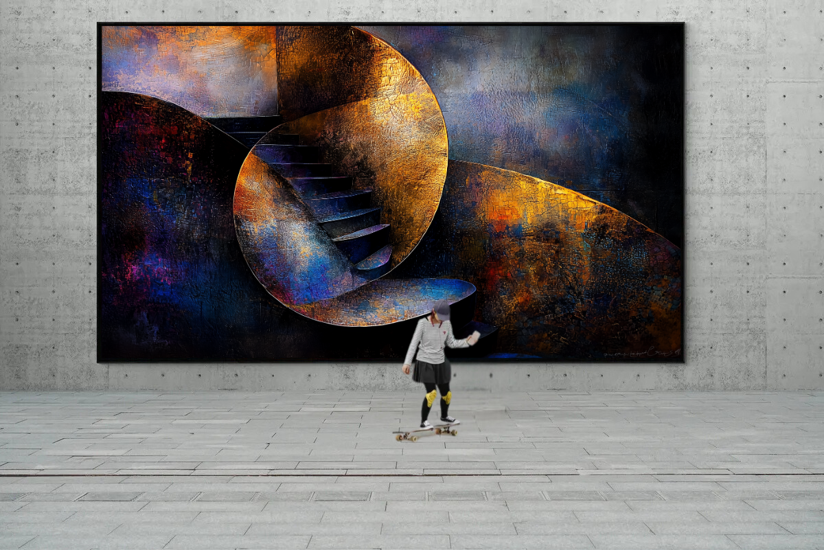 „Treppe ins Ungewisse“ ist mehr als nur ein Gemälde – es ist ein Tor zu inneren Reisen und philosophischen Gedanken, das jedes Ambiente mit Eleganz und Bedeutung bereichert.