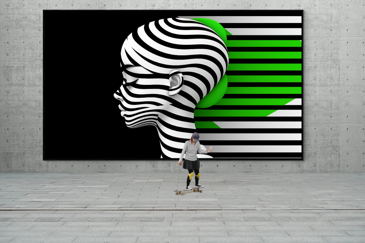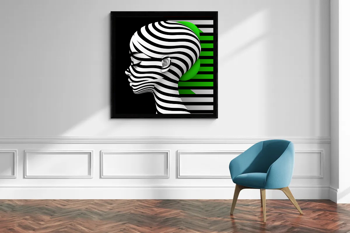 „Verbindung der Dimensionen“ zeigt eine stilisierte Darstellung eines menschlichen Profils, das in hypnotische Schwarz-Weiß-Streifen gehüllt ist. Diese Streifen verschmelzen fließend, wodurch das Gefühl einer Bewegung entsteht. Grüne Akzente verleihen dem Bild eine energetische Note und stehen in starkem Kontrast zur monochromen Grundgestaltung. Dieses Kunstwerk strahlt eine futuristische Ästhetik aus und erinnert daran, dass wir oft zwischen verschiedenen Welten – Realität und Fantasie – schweben.