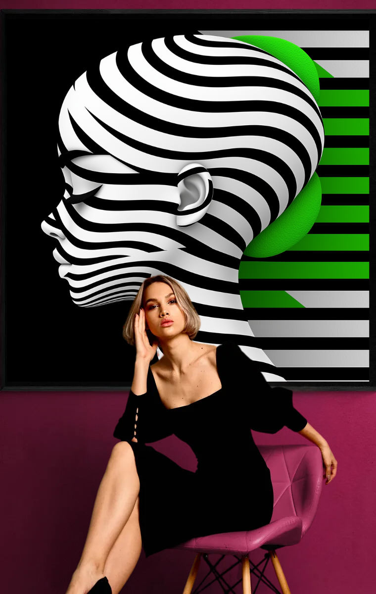 - Optische Kunst (Op-Art) und Surrealismus: Das Kunstwerk kombiniert die hypnotische Anziehungskraft der Op-Art mit surrealen Elementen, um eine visuelle Illusion und eine ungewöhnliche Realität zu schaffen.
