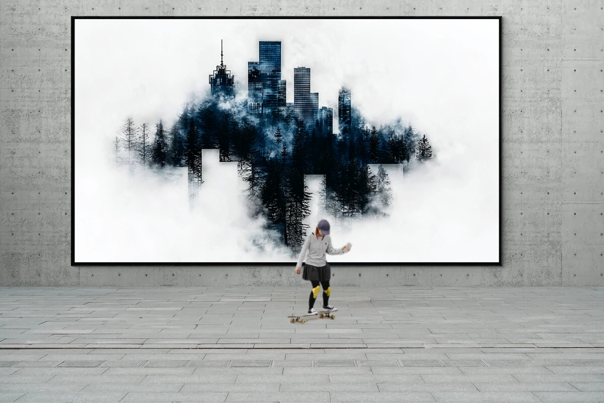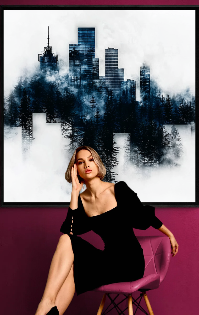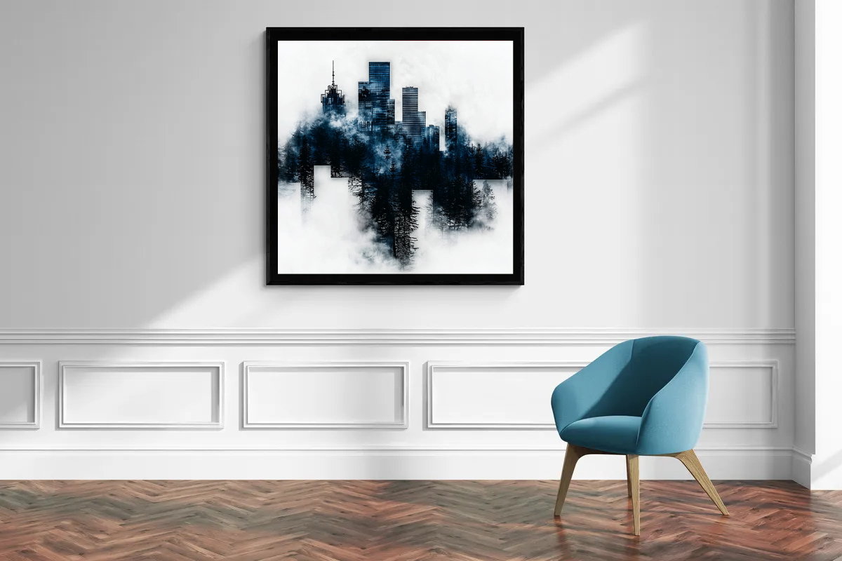 In diesem eindrucksvollen Werk verschmilzt die moderne Skyline mit der geheimnisvollen Dunkelheit eines dichten Waldes, der in Nebel gehüllt ist. Die kühlen Blautöne der Gebäude und die tiefen Schatten der Bäume erschaffen eine perfekte Symbiose aus urbanem Leben und unberührter Natur. Der weiße Hintergrund verstärkt die mystische Atmosphäre und lässt die Silhouette wie ein schwebendes Kunstwerk wirken, in dem Stadt und Natur in perfekter Harmonie koexistieren.